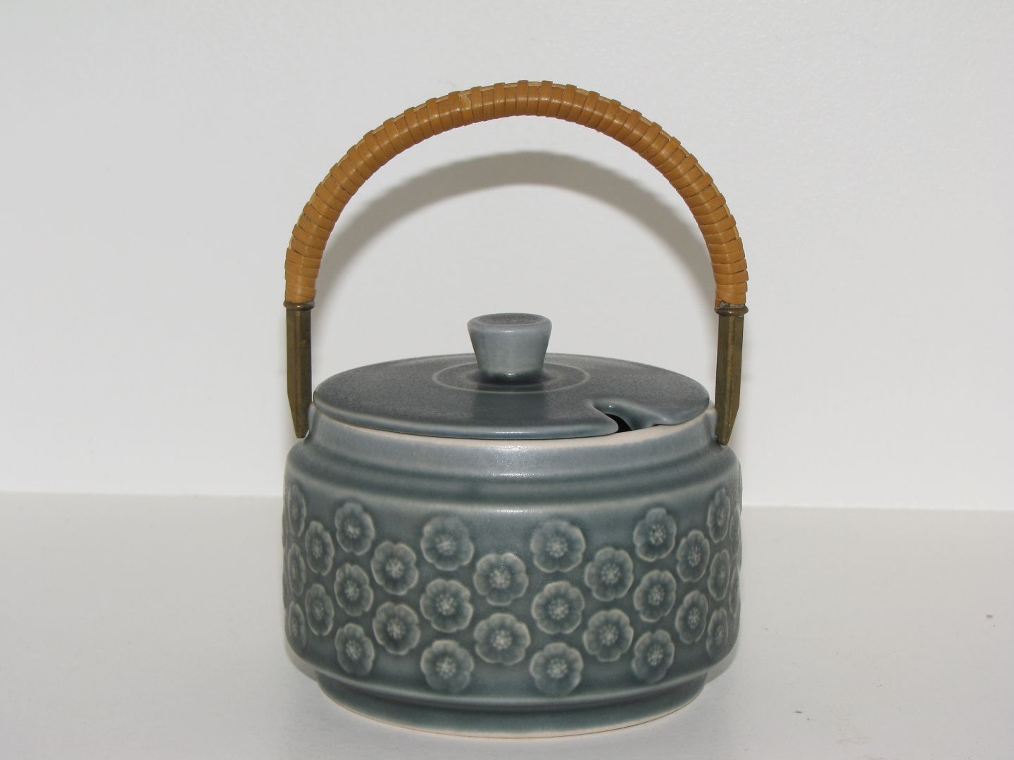 Beskrivelse: Kronjyden, Azur stentøj, marmeladekrukke med basthank.