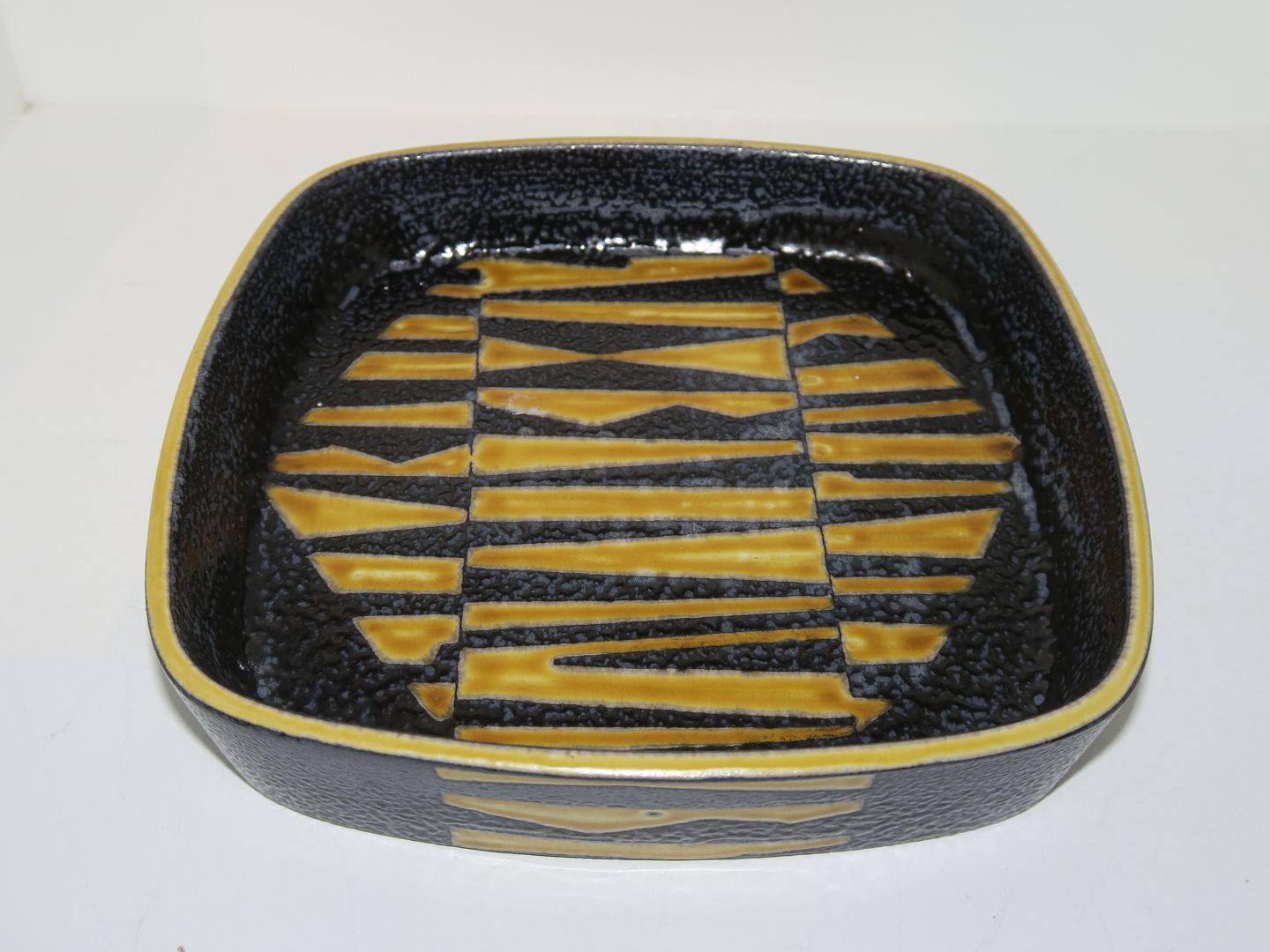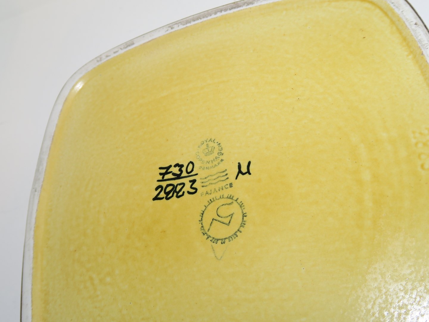 Beskrivelse: Royal Copenhagen Fajance Baca gul firkantet skål.