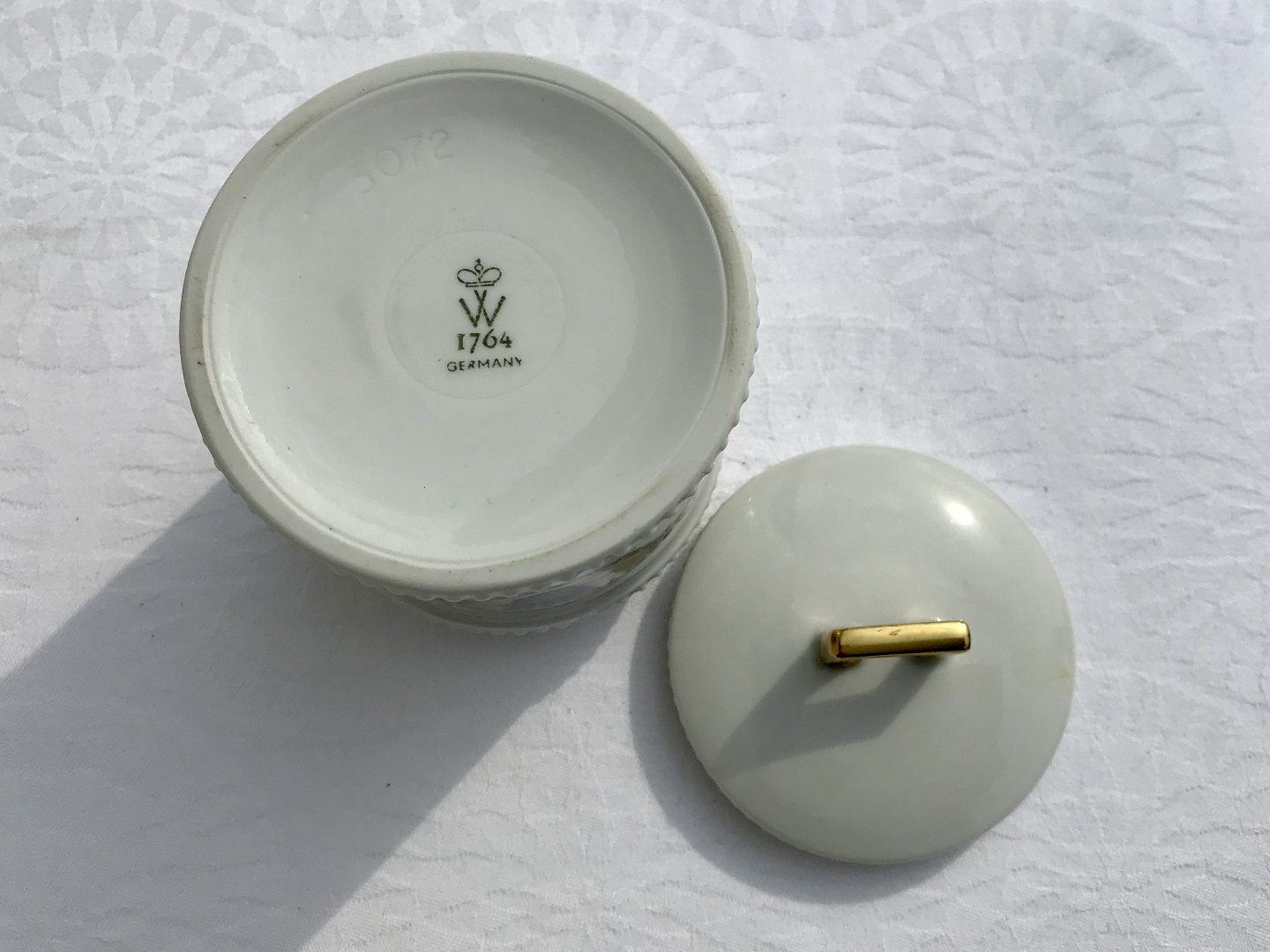 Description: Niedriger Topf, Wallendorfer Porzellan, Deutschland. Mit klassischen Motiven. 10cm hoch, 8cm im Durchmesser, * guter Zustand *