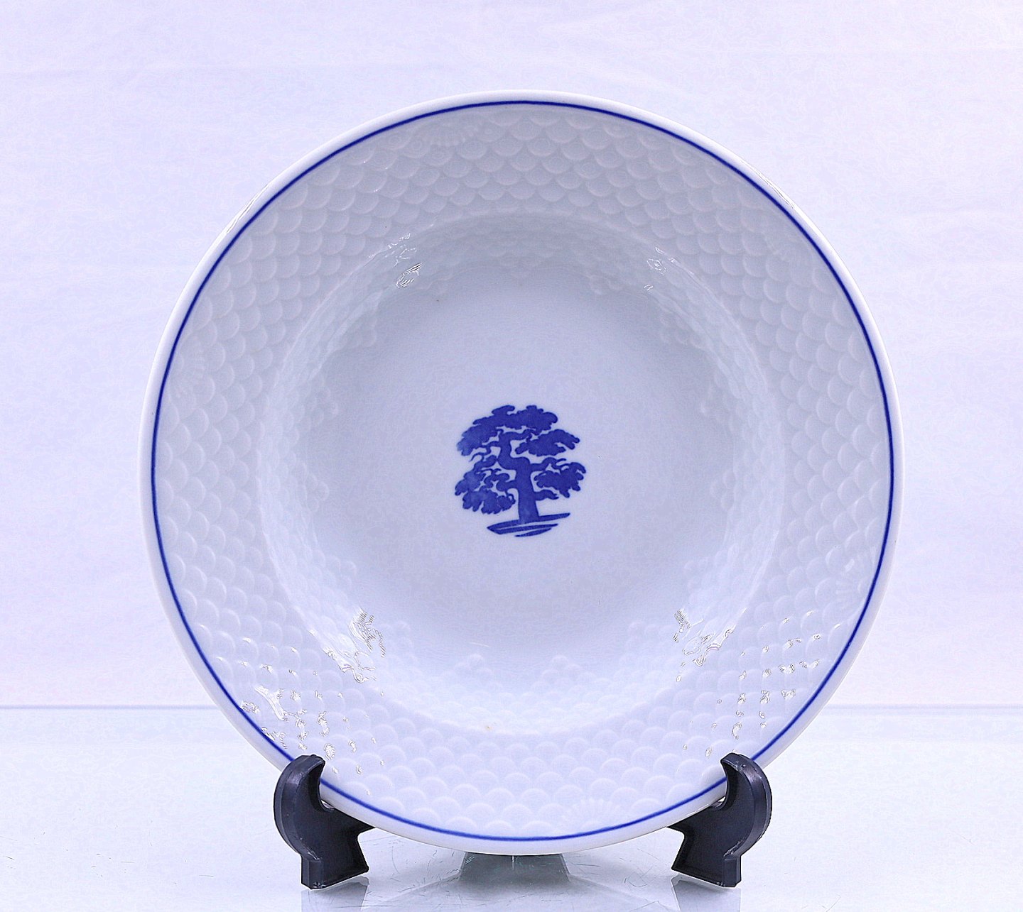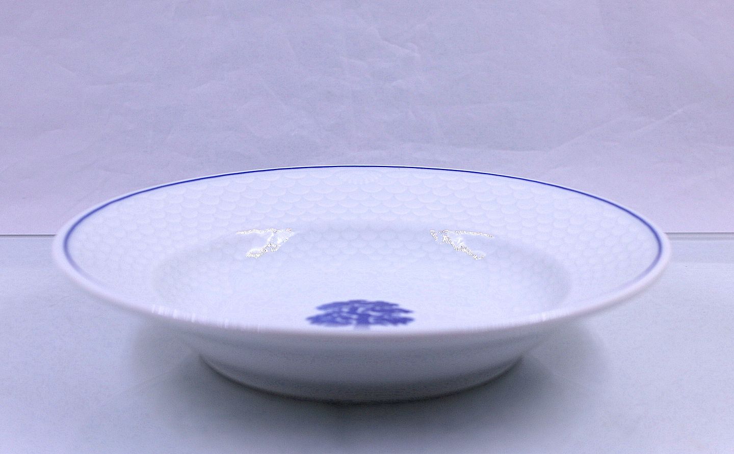 Restaurants porcelæn, hvidt porcelæn med stiliseret, blåt, egetræ som dekoration.