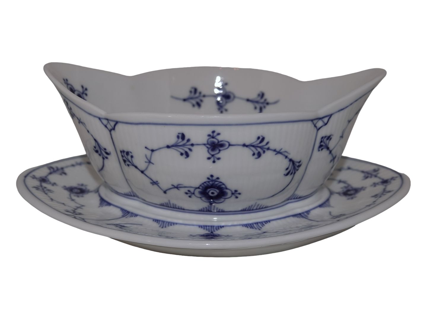 Beskrivelse: Royal Copenhagen Musselmalet Riflet Hotelporcelæn, sovseskål md tyk kant.
