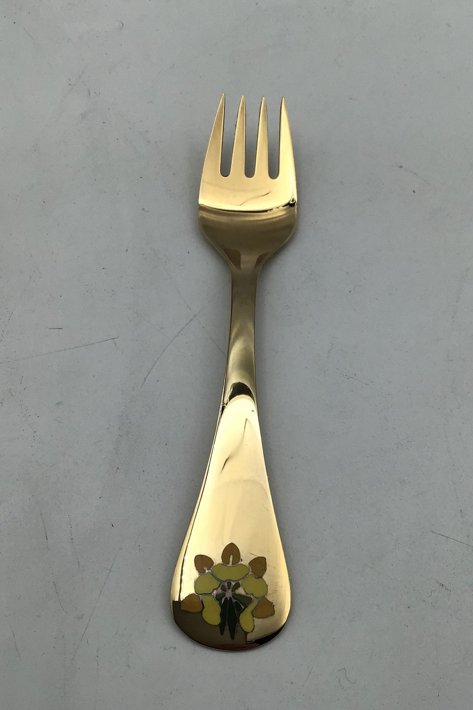 Beskrivelse: Georg Jensen Årsgaffel 1991 Forgyldt Sterling Sølv med emalje. Måler 14.5 cm (5.70 inch)