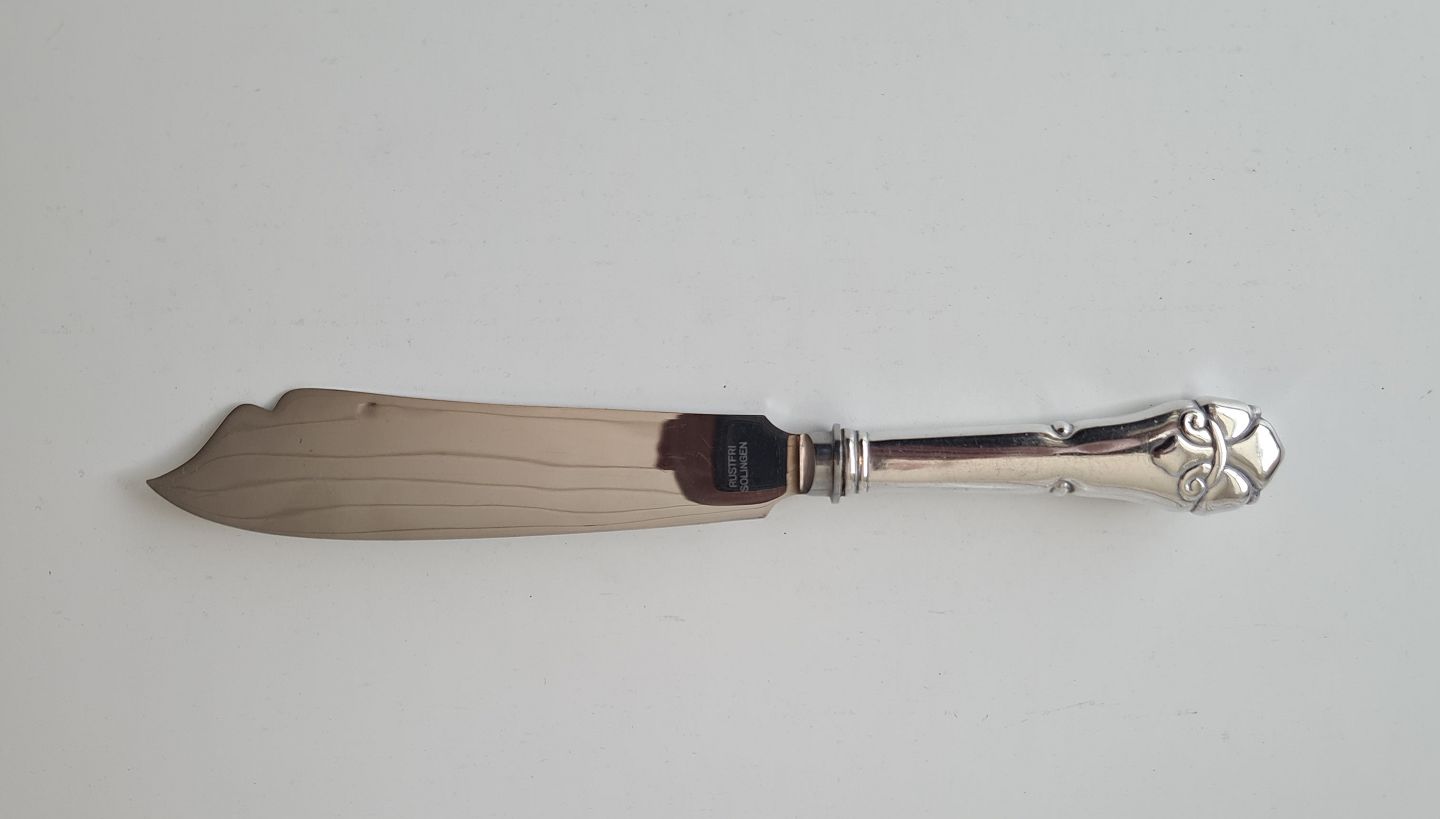 Fransk lilje lagkagekniv i sølv og stål 26,5 cm.