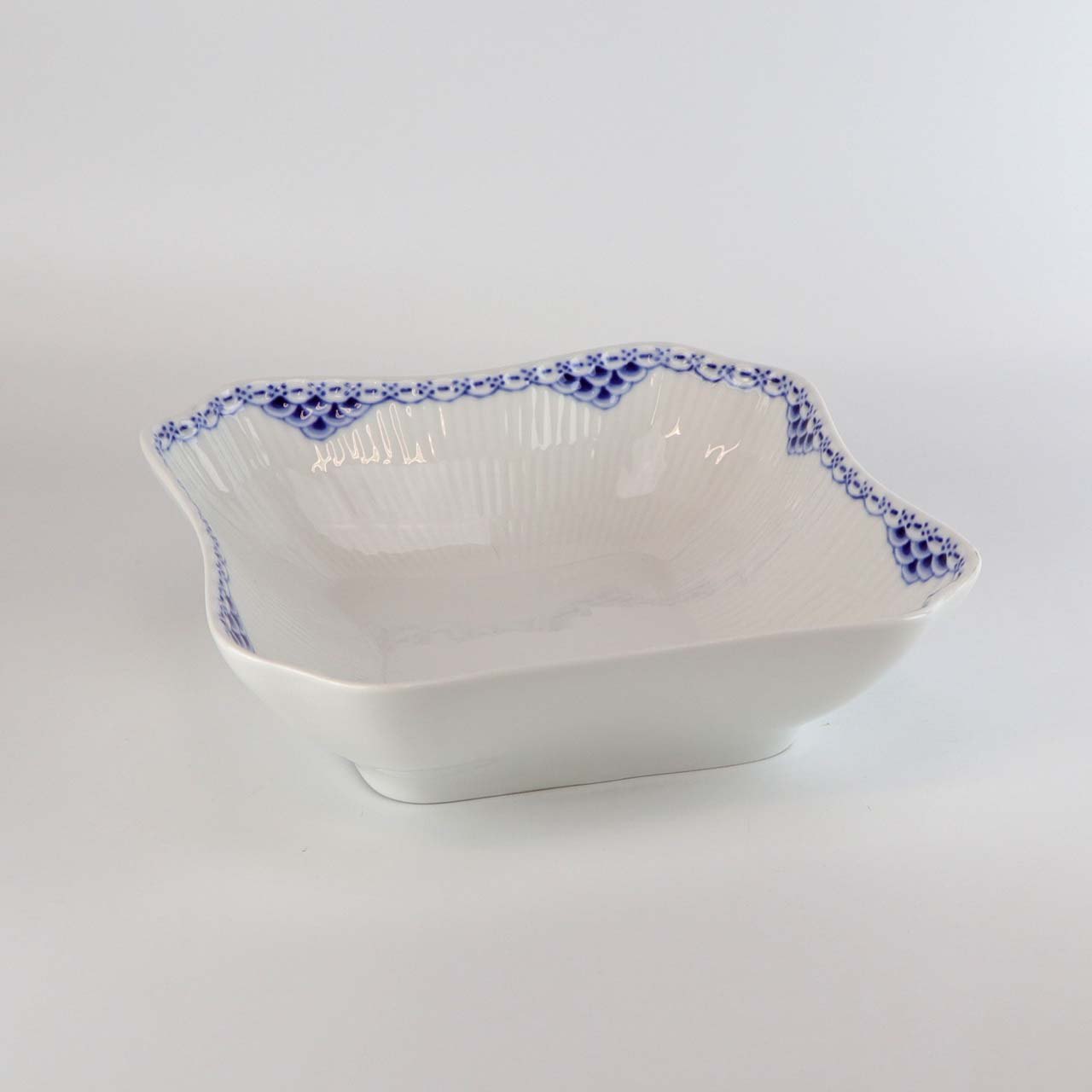 Stellet er fremstillet i riflet hvidt porcelæn med blåmalet blonder og fiskeskældsdekoration