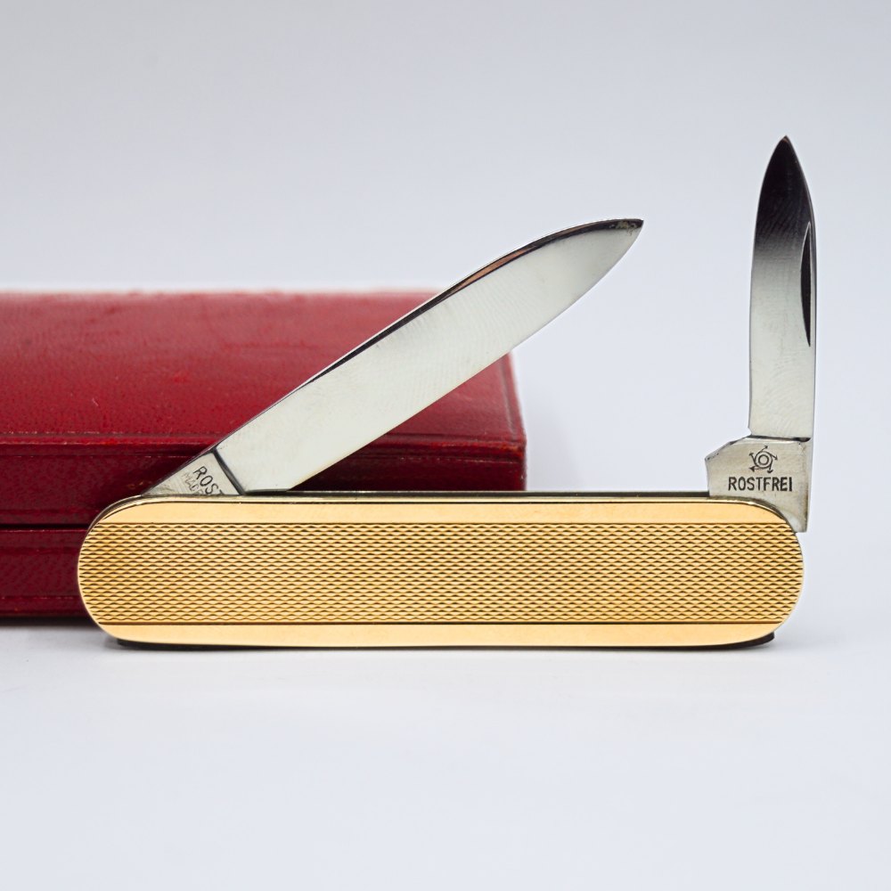 Beskrivelse: Axel Holm; Lommekniv i 14 kt. guld og stål, med to knivblade. L. foldet sammen 7 cm. B. 1,5 cm. L. udfoldet 15,5 cm.
