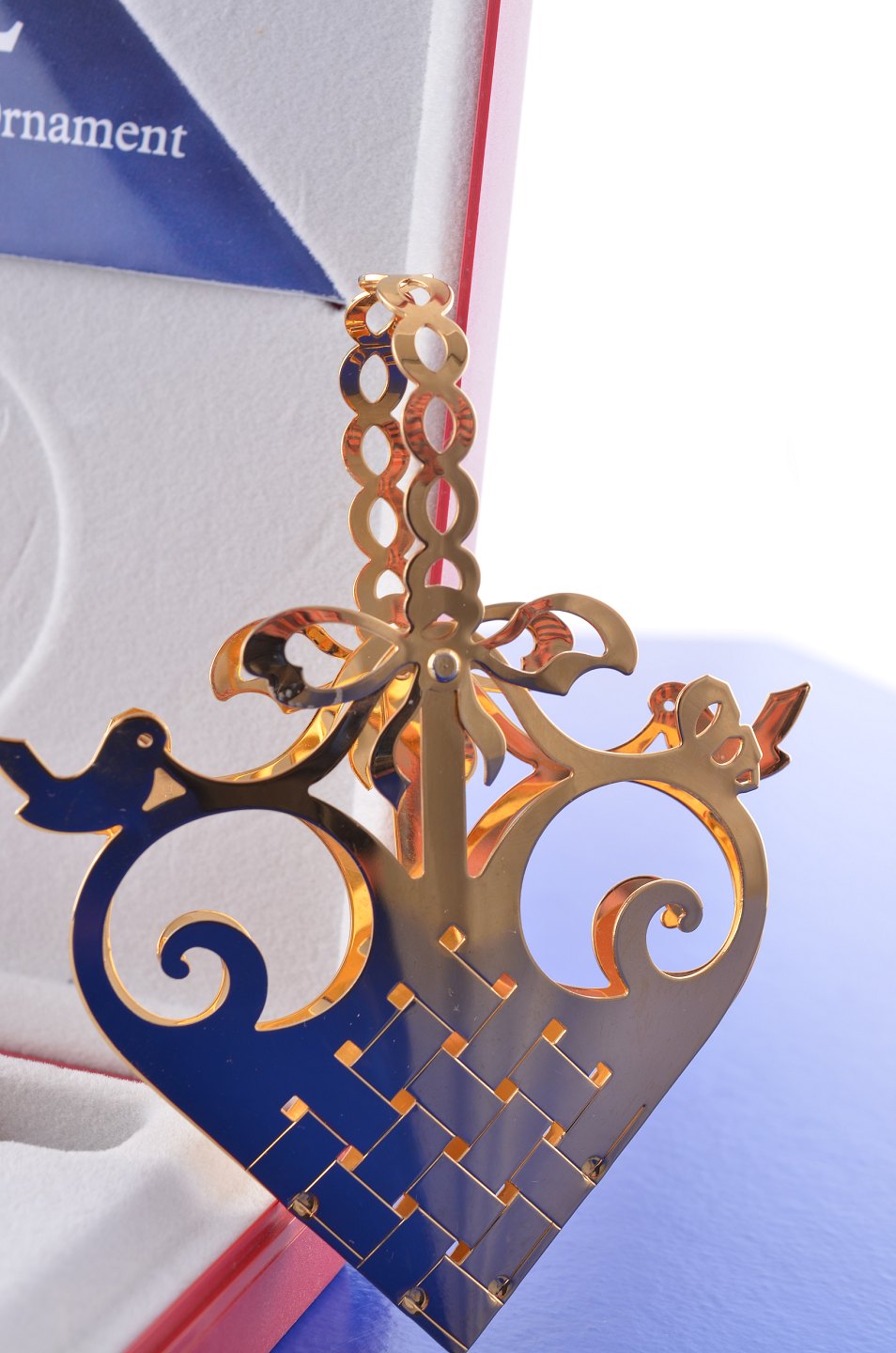 Beskrivelse: Georg Jensen Julepynt. Juleuroen år 1992 med Spurveskjul motiv, forgyldt messing. Designet af kunstneren. Jette Frölich. Pæn velholdt stand, med æske.