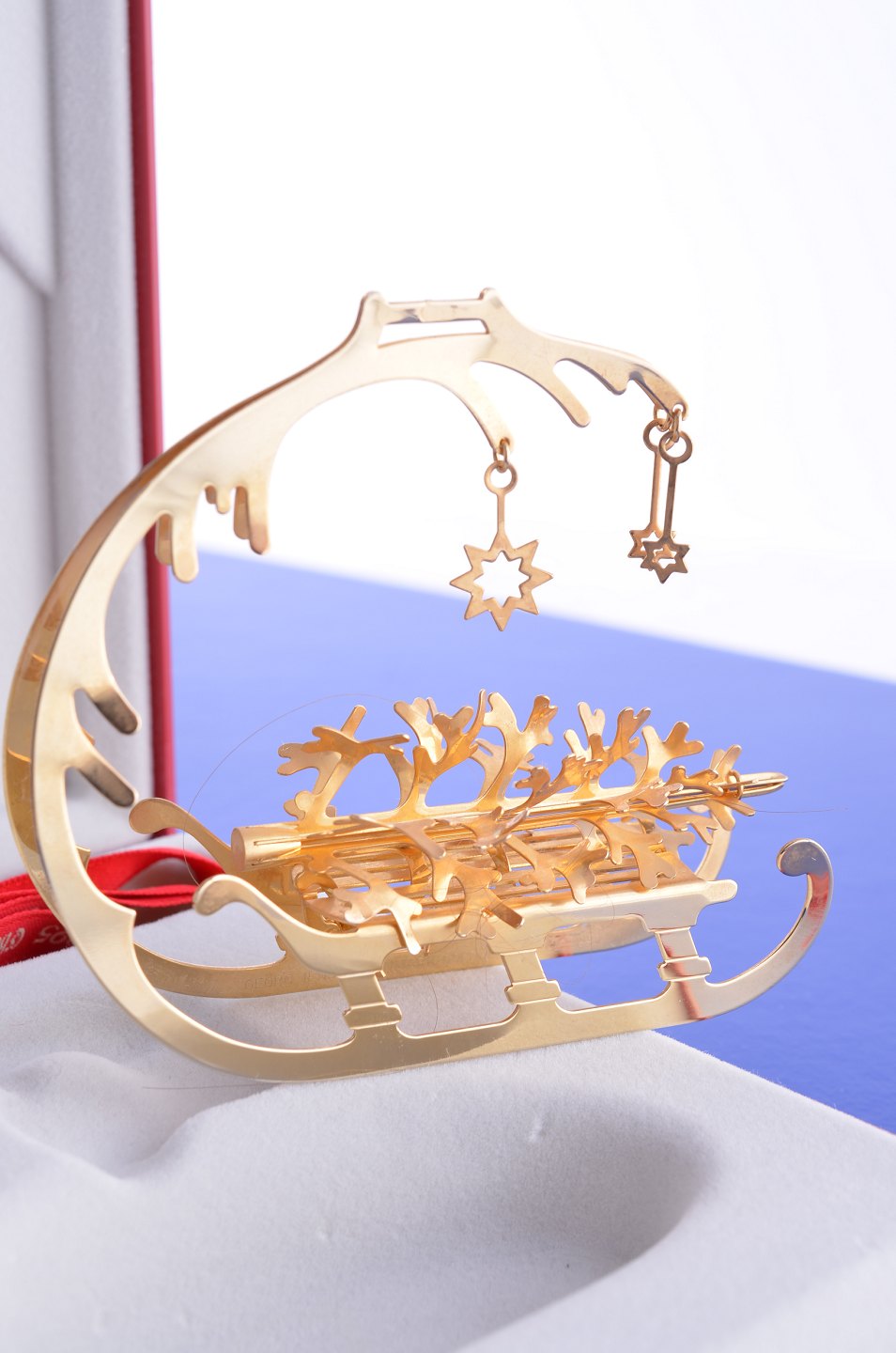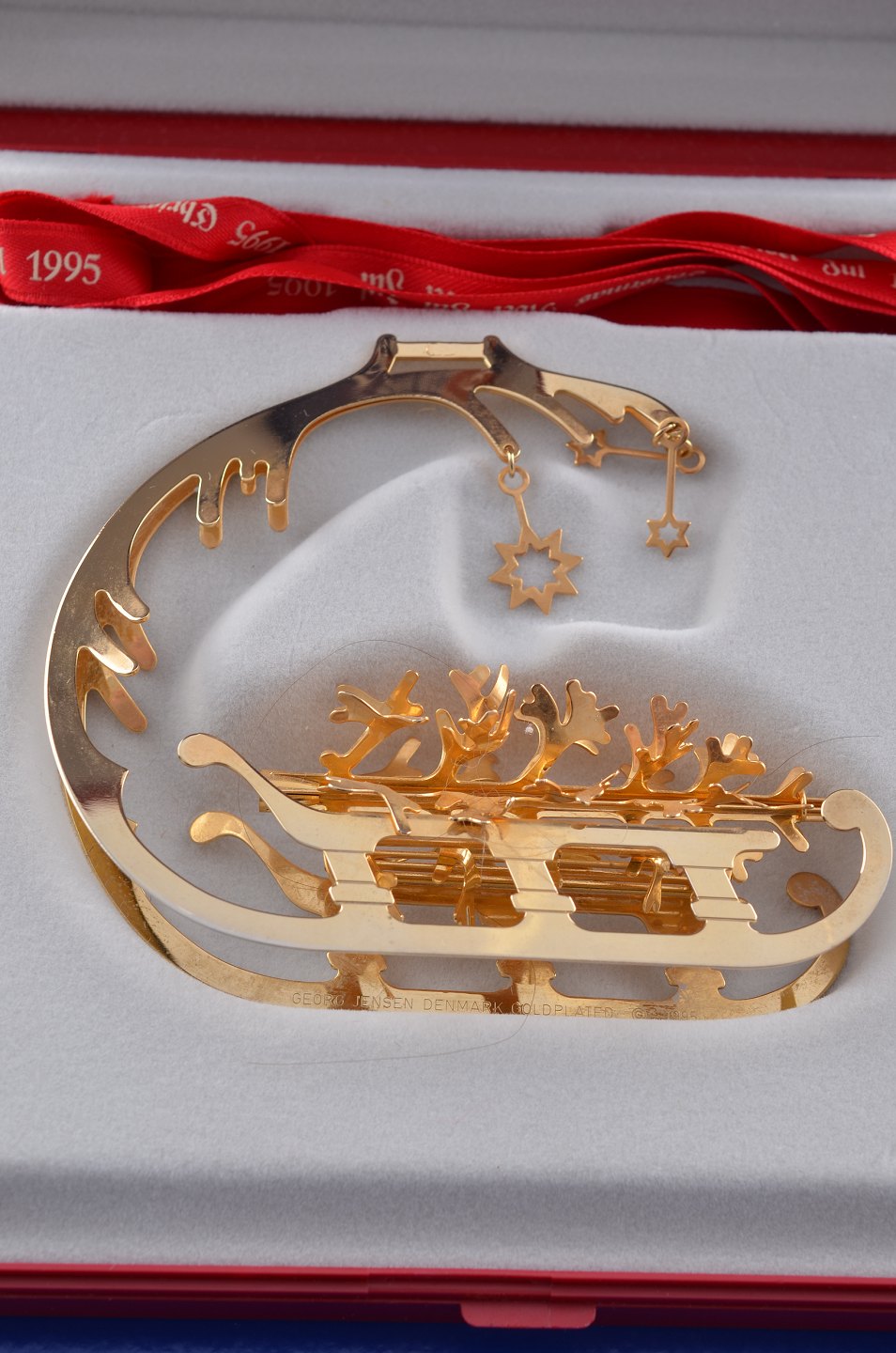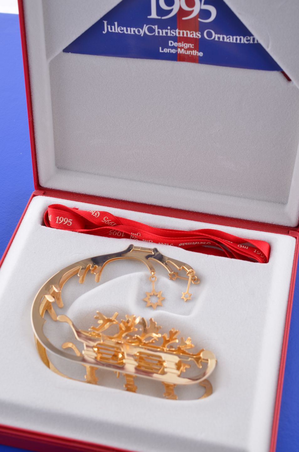 Beskrivelse: Georg Jensen Julepynt. Juleuroen år 1995 med juleslæde motiv, forgyldt messing. Designet af kunstneren. Lene Muntbe. Pæn velholdt stand, med æske.
