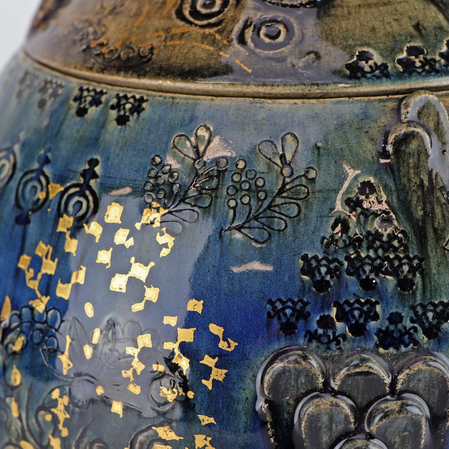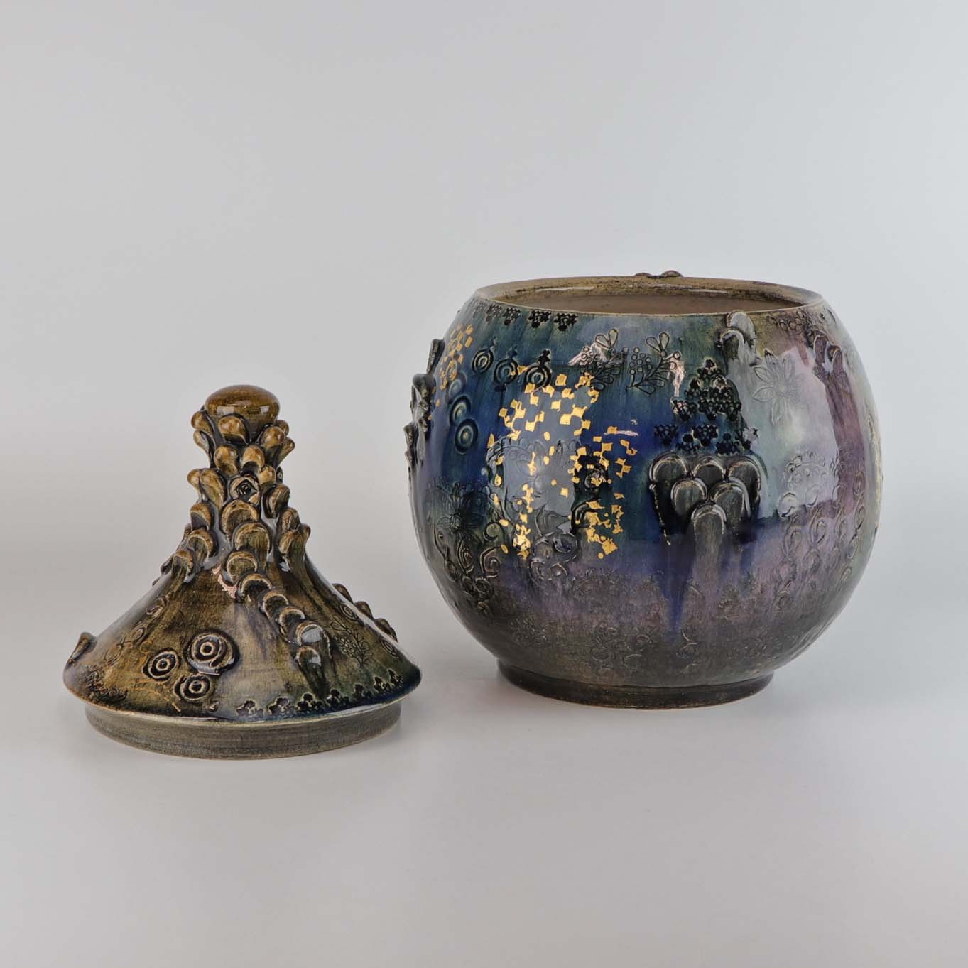 Beskrivelse: Stor lågkrukke i keramik med multifarvet glasur og dekoreret med forskellige abstrakte og naturmotiver.