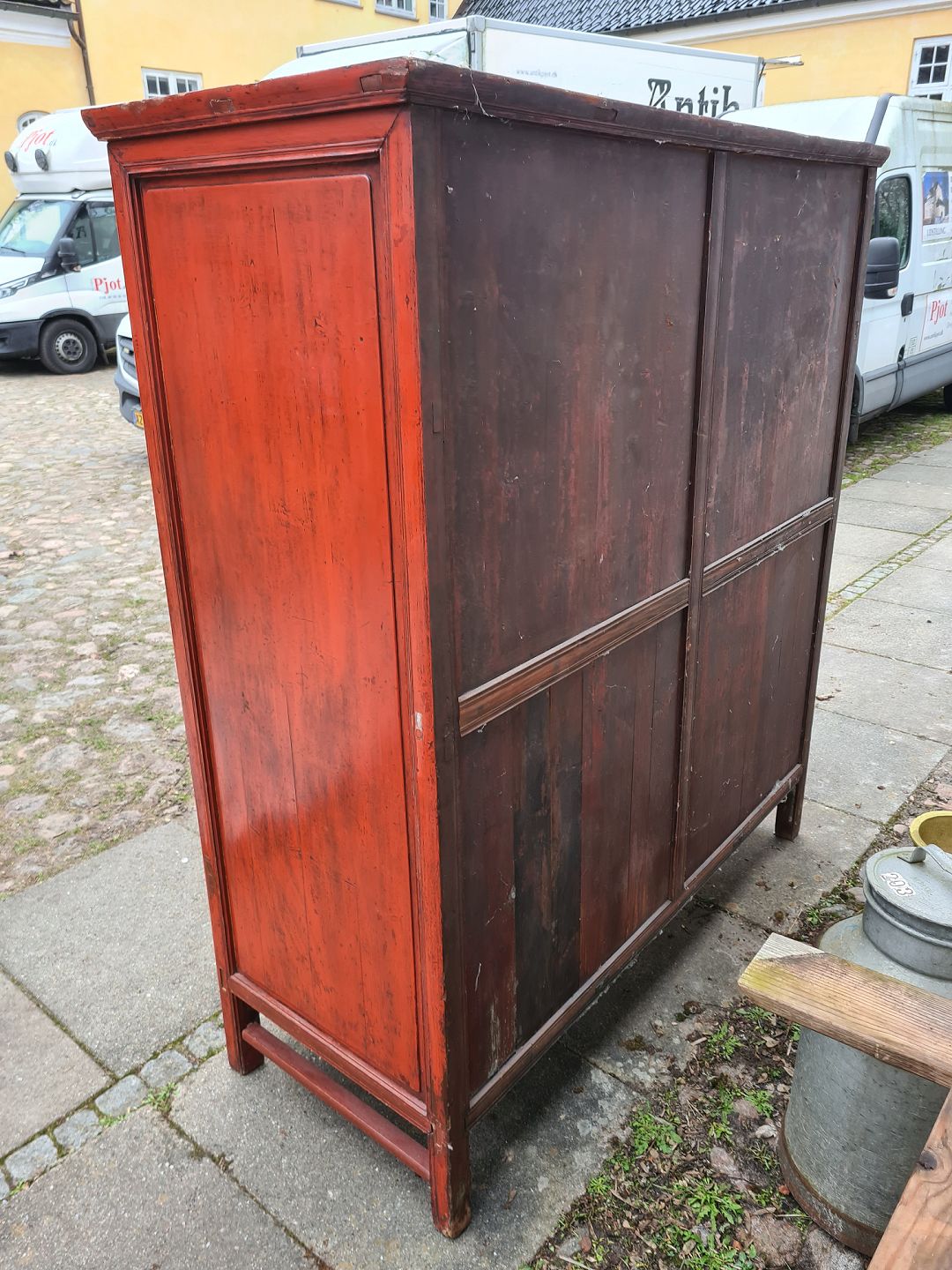 Beskrivelse: Kinesisk dækketøjsskab i original rød bemalet træ.