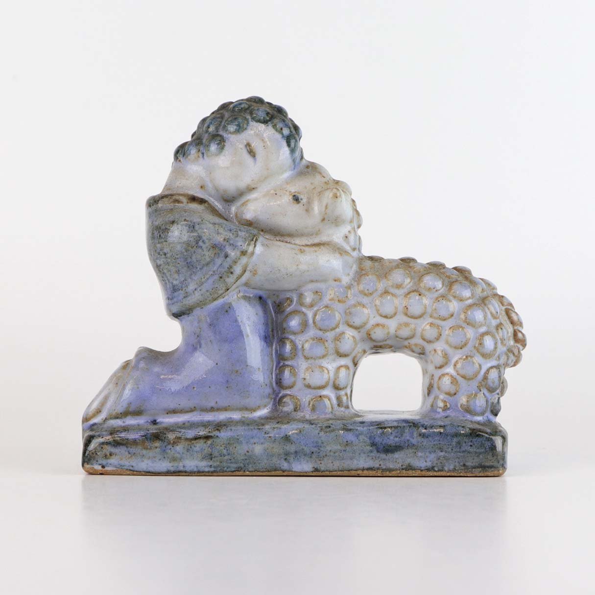 Beskrivelse: Figur i glaseret keramik med motiv af lille pige som omfavner et lam. Nr. 515