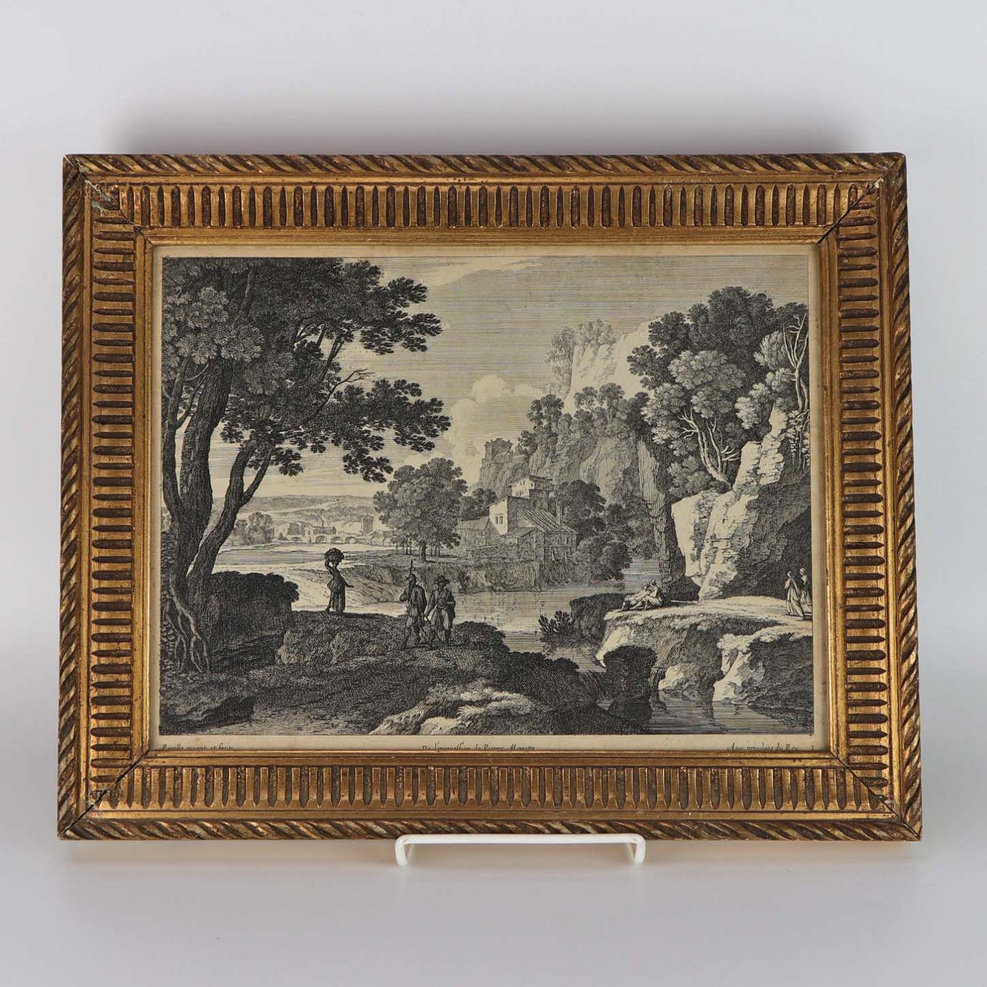 Beskrivelse: Indrammet bogtryk i guldmalet struktureret træramme med motiv af grupper af mennesker i klippeområde med udsigt til huse og flod.