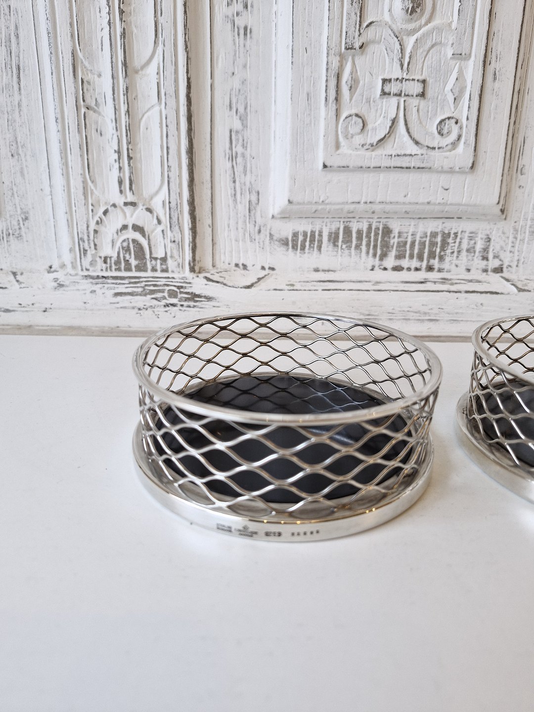 Beskrivelse: Par meget smukke flaskebakker i sterlingsølv med bund af bakelit. Designet af Svend Weihrauch for F.Hingelberg