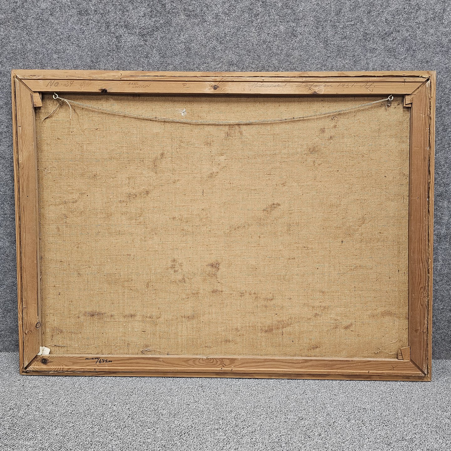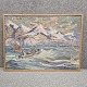 Beskrivelse: Oliemaleri på lærred, med motiv af fjeldene i Lofoten og en båd på fjorden.