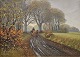 Beskrivelse: Oliemaleri på lærred, sat i guldramme, med motiv af en hestevogn som kører på en mudret vej gennem en skov.