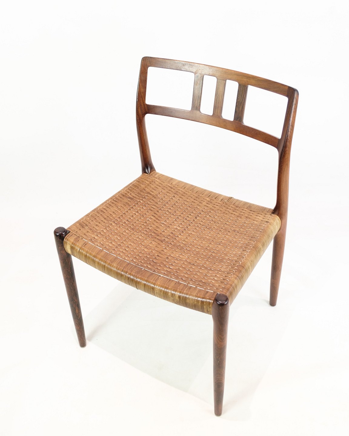 Description: Set of 4 dining chairs, model 79, designed by Niels Otto Møller and manufactured by JL Møllers Møbelfabrik in the 1960s. The chairs are made of rosewood with hand-woven flat-weave seats. A fine example of Danish furniture design with a focus on craftsmanship, form and materials.