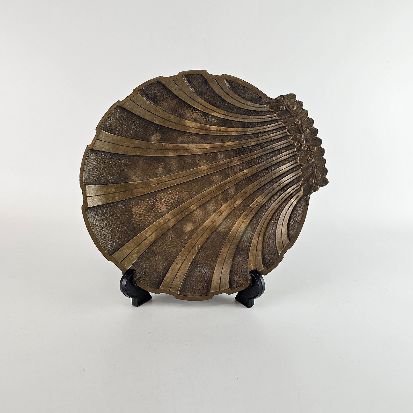 Beskrivelse: Art Deco skål af massivt bronze formet som muslingeskal med bladdetaljer.