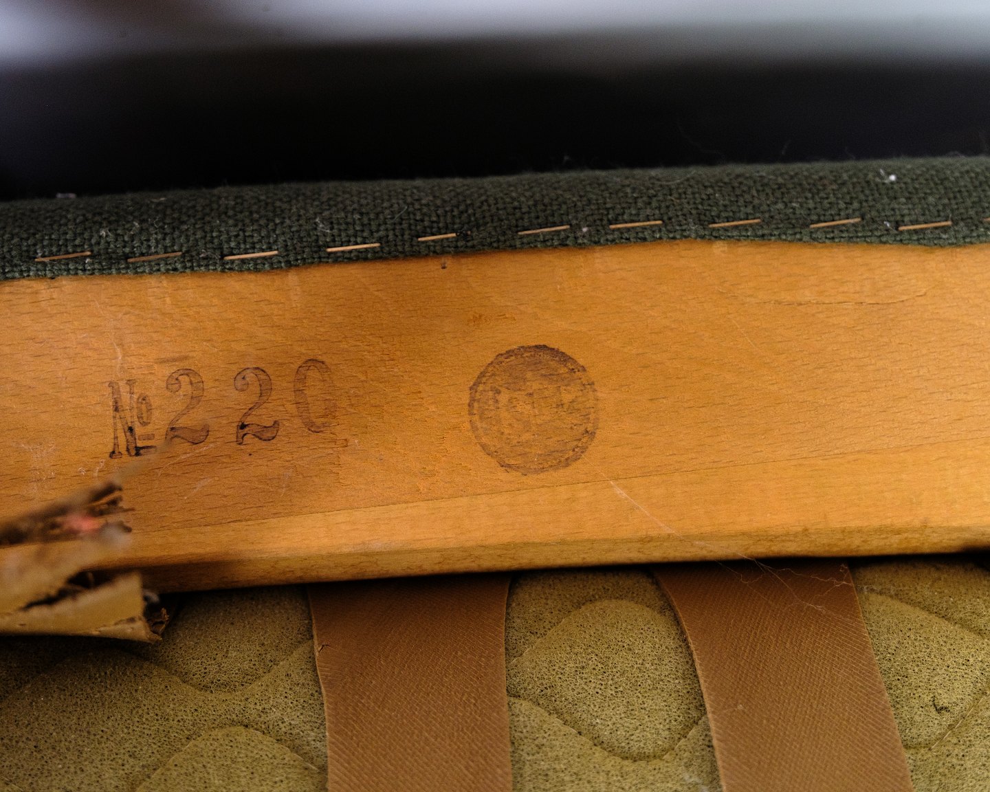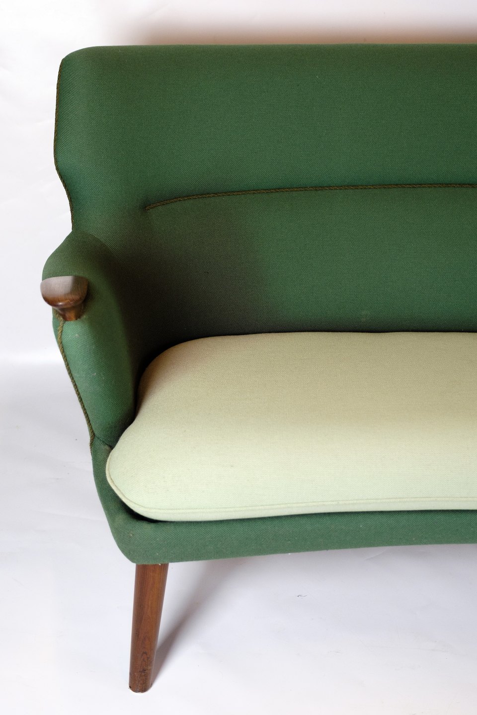 Beskrivelse: Grøn Sofa model 220, med lyst hyndebetræk af den danske møbelarkitekt Kurt Olsen. Sofaen er blevet fremstillet i 1960'erne med stof af høj kvalitet med "negle" og ben af massiv palisander. Sofaen fremstår i fin brugt stand med brugsslid.