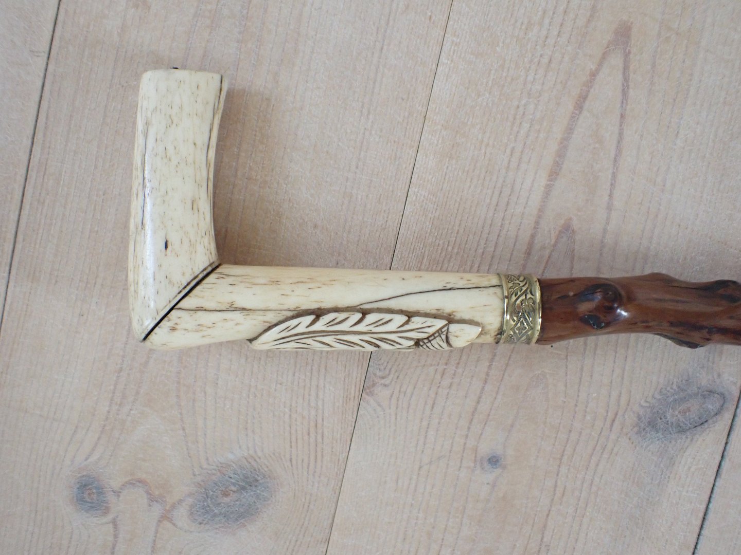 Beskrivelse: Stok med greb af udskåret ben med en agerngren fæstet til en tjørnestok med et dekoreret messingbånd og med dupsko af horn. Engelsk? Ca. 1900. Længde: 81,5 cm. I pæn tidstypisk stand med en enkelt tørrerevne i træet.