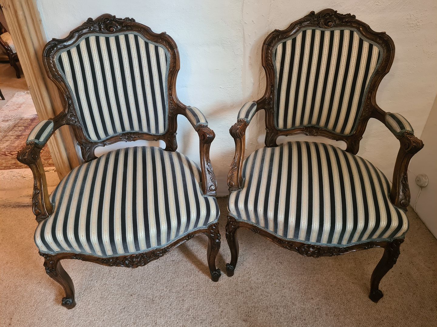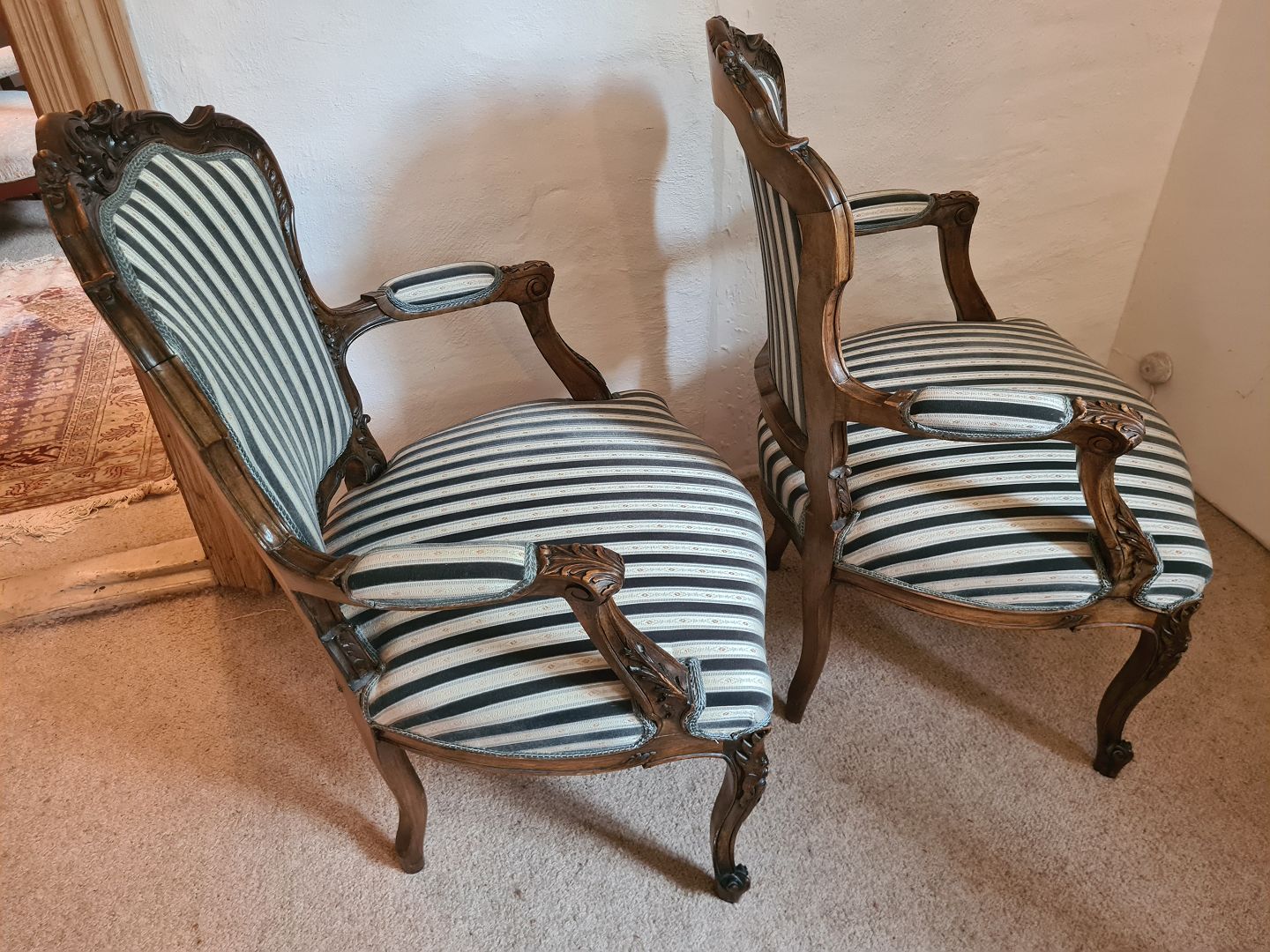 Beskrivelse: Par rokokostole fra 1950'erne i mahogni og med delvis velour polstring. Fremstår gode og stabile uden nævneværdige brugsspor.