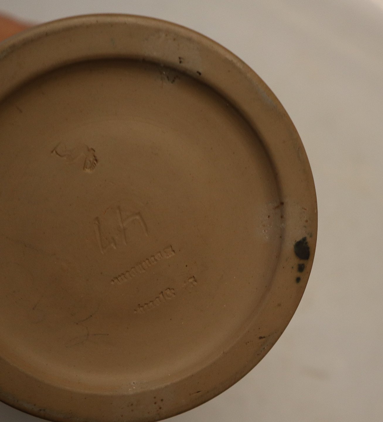 Beskrivelse: Brun Vase 19.5 cm Frugt dekoration #47 L. Hjorth Bornholm Denmark
