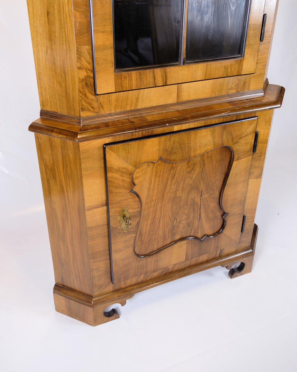 Description: Antique display cabinet in baroque style from around 1900. Made of walnut with glass door and bars. Elegant corner cabinet with a classic look.