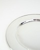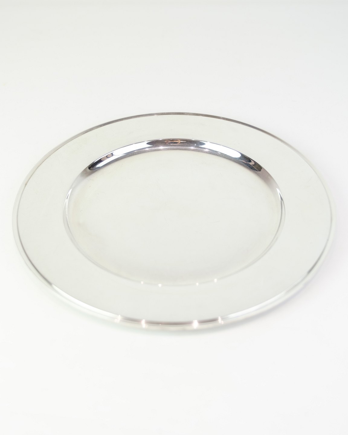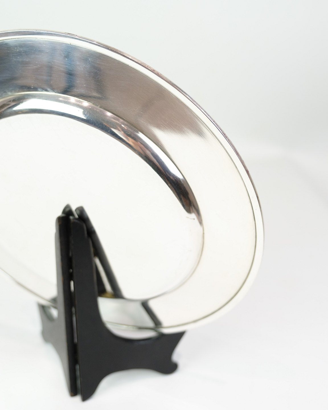 Beskrivelse: Georg Jensen dækketallerken i sterling sølv, Pyramide model No. 600E. Diameter 26 cm, vægt 522 g. Elegant dansk designklassiker.