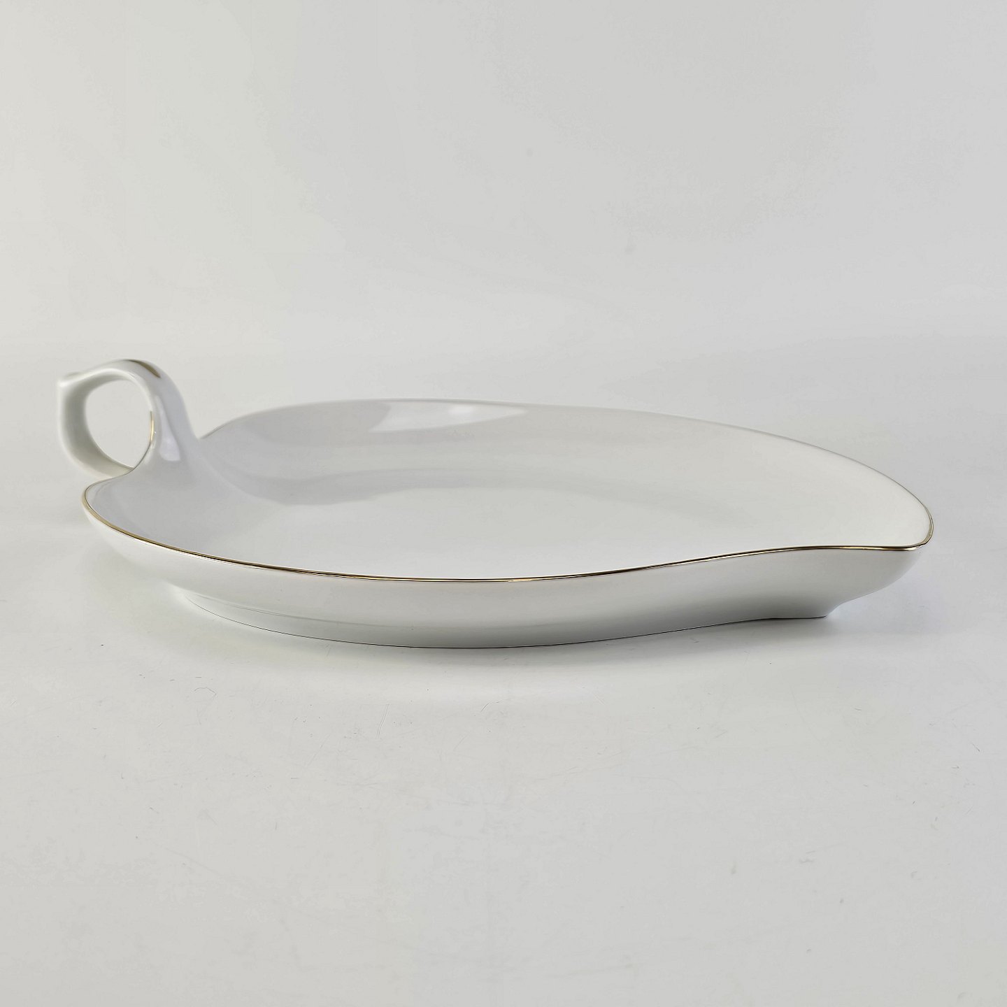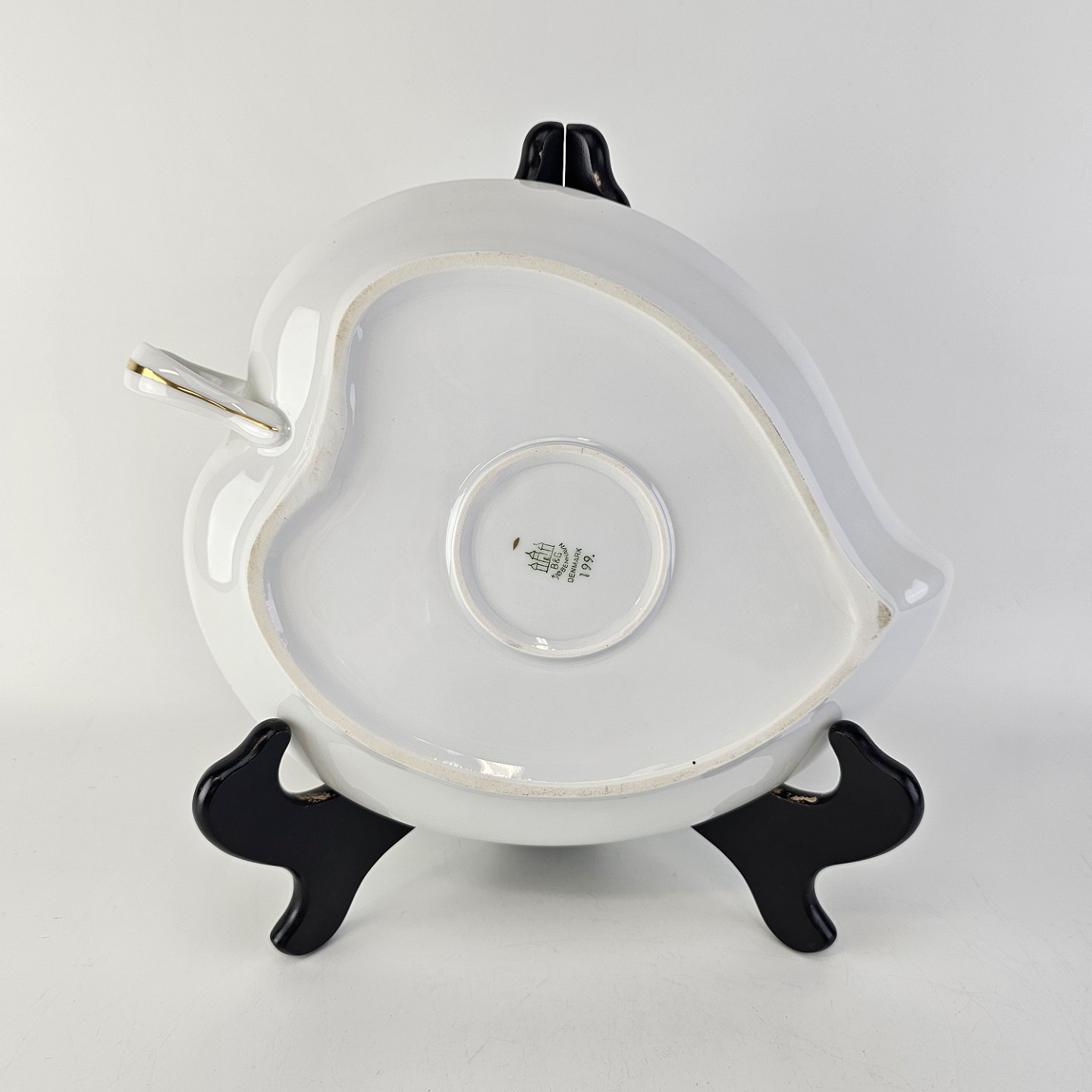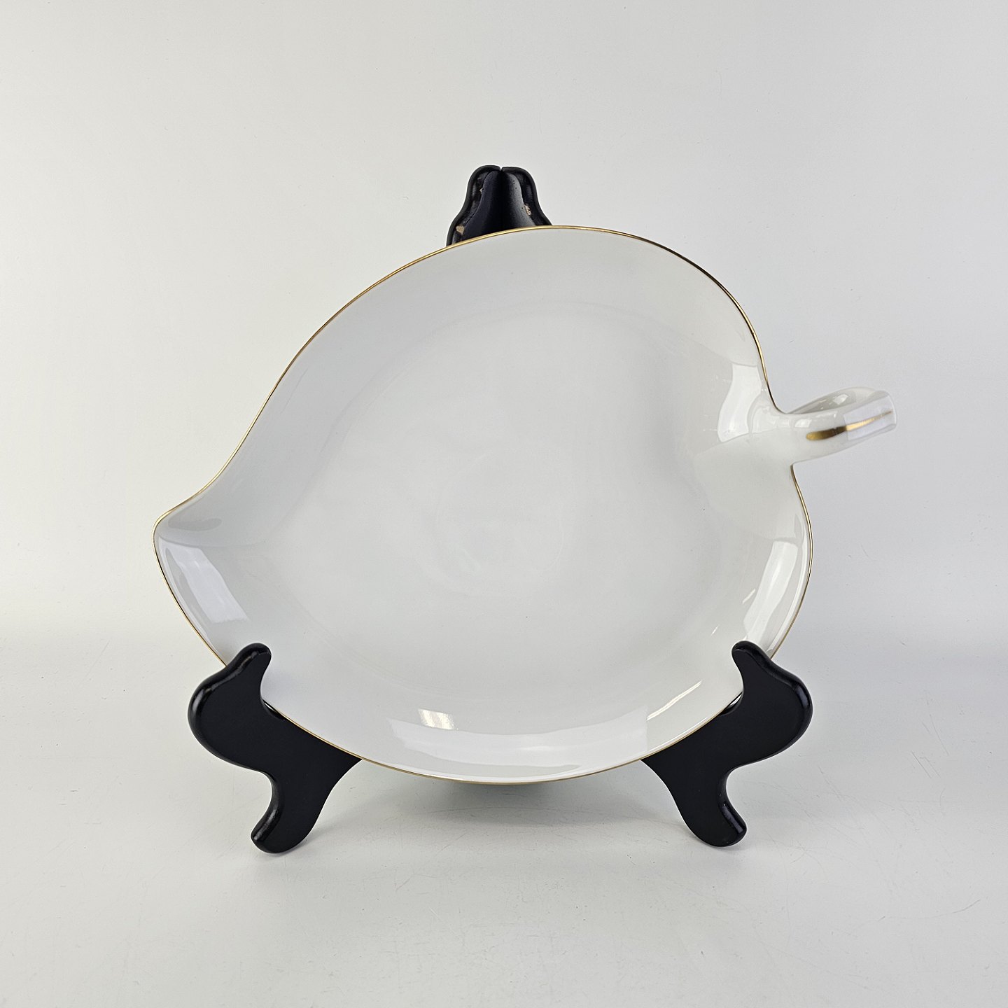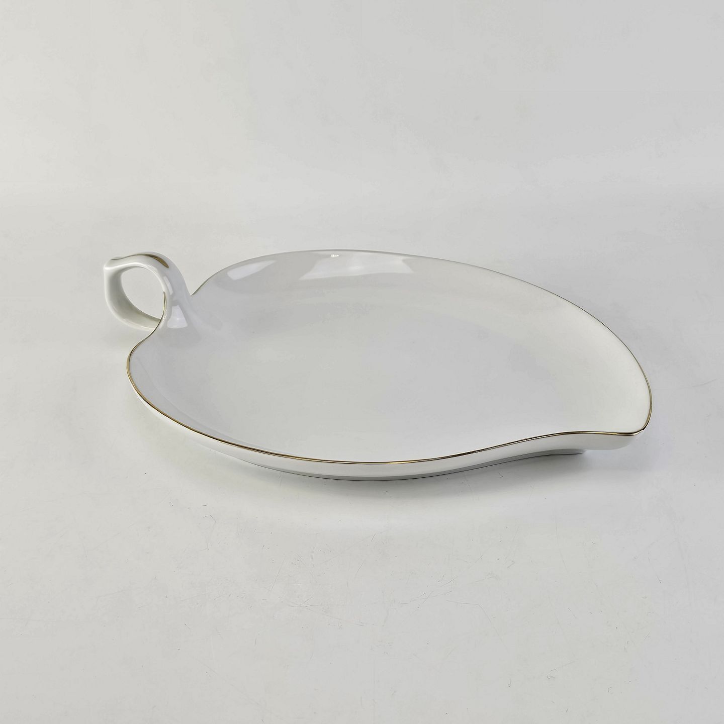 Beskrivelse: Bladformet fad i porcelæn fra stellet Leda