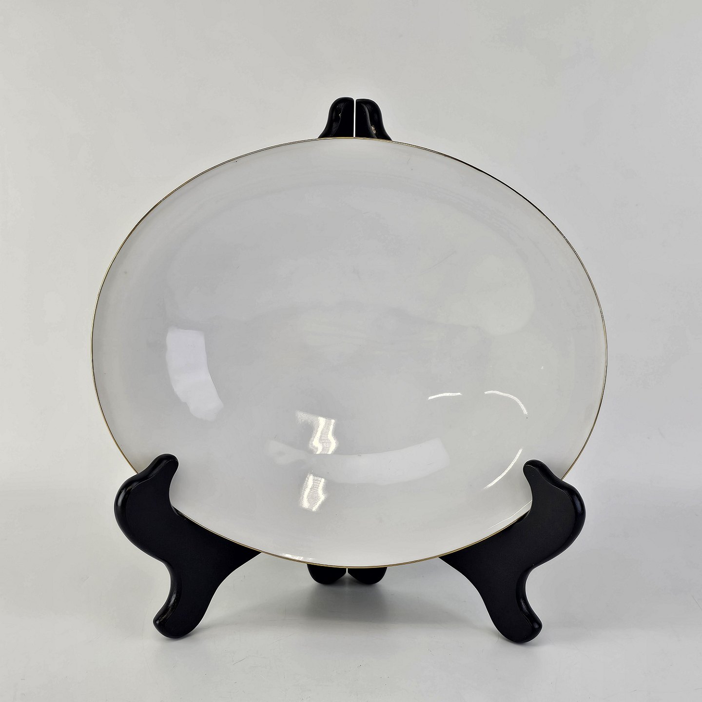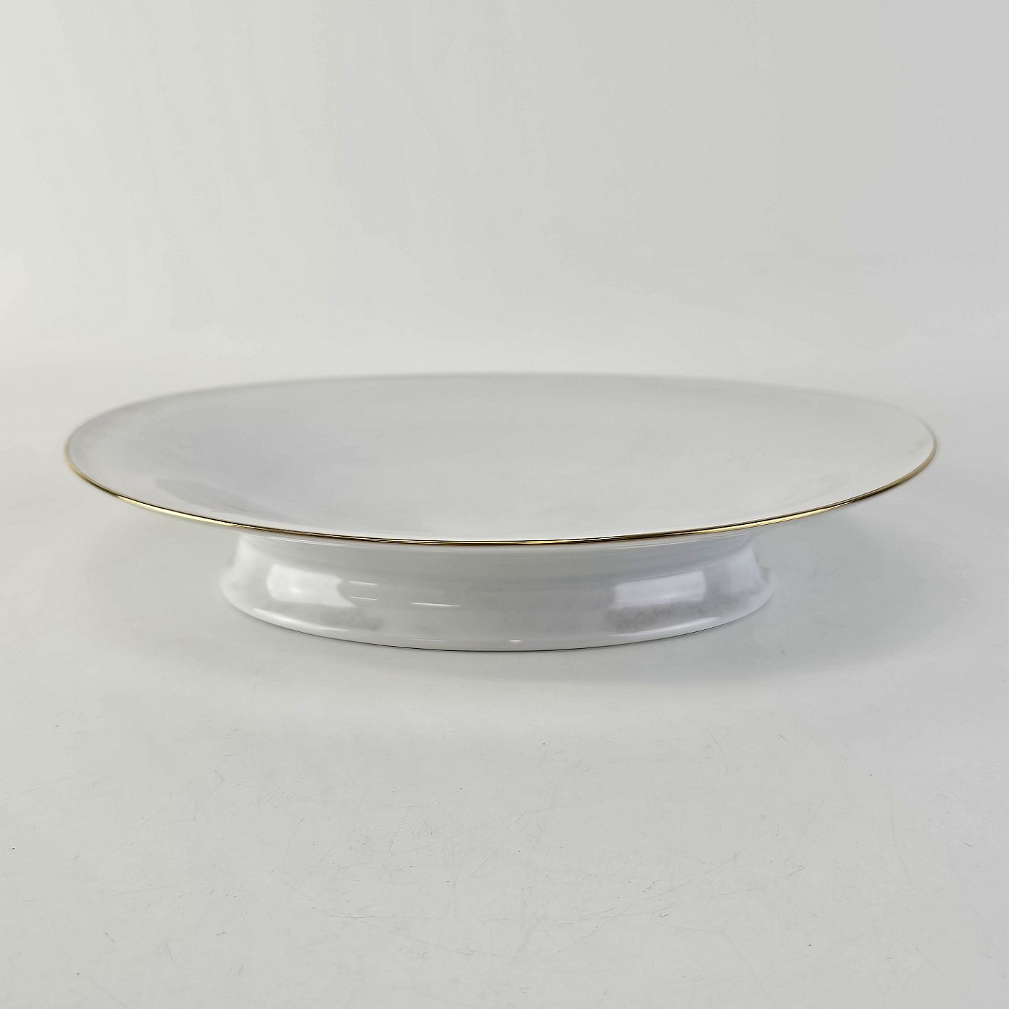 Beskrivelse: Ovalt fad på fod i porcelæn fra stellet Leda