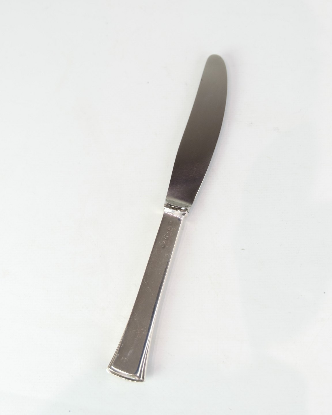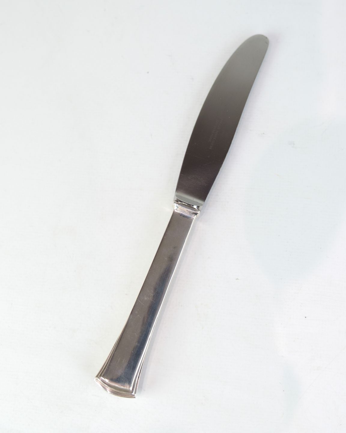 Description: Evald Nielsen dinner knife in real silver. Congo pattern No. 32 with short handle. Length 23 cm. Classic Danish silverwork.