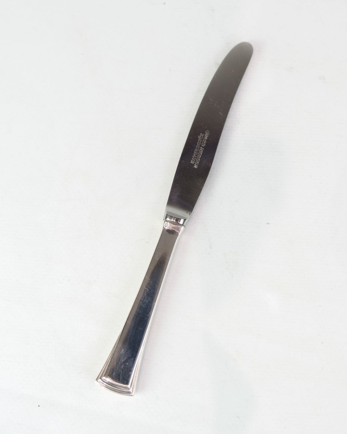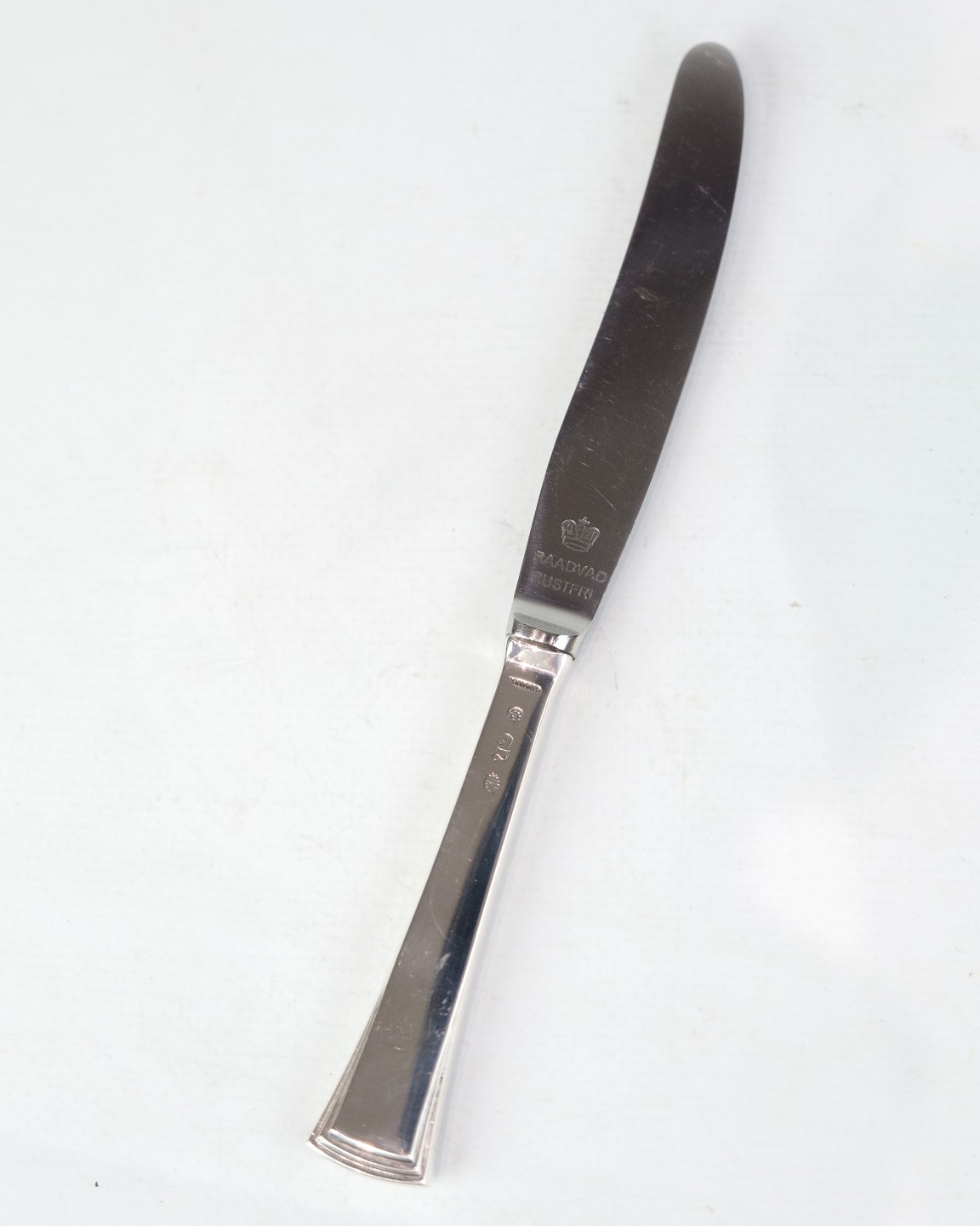Description: Evald Nielsen butter knife in real silver. Congo pattern No. 32 with short handle. Length 17 cm. Classic Danish silverwork.