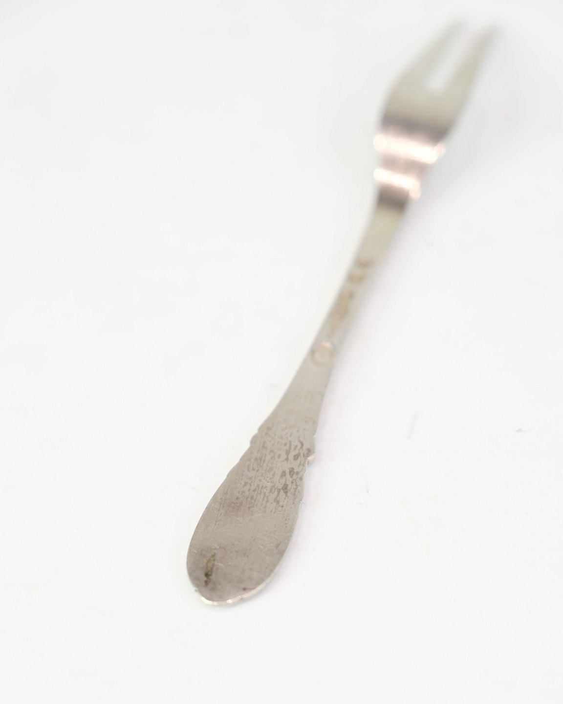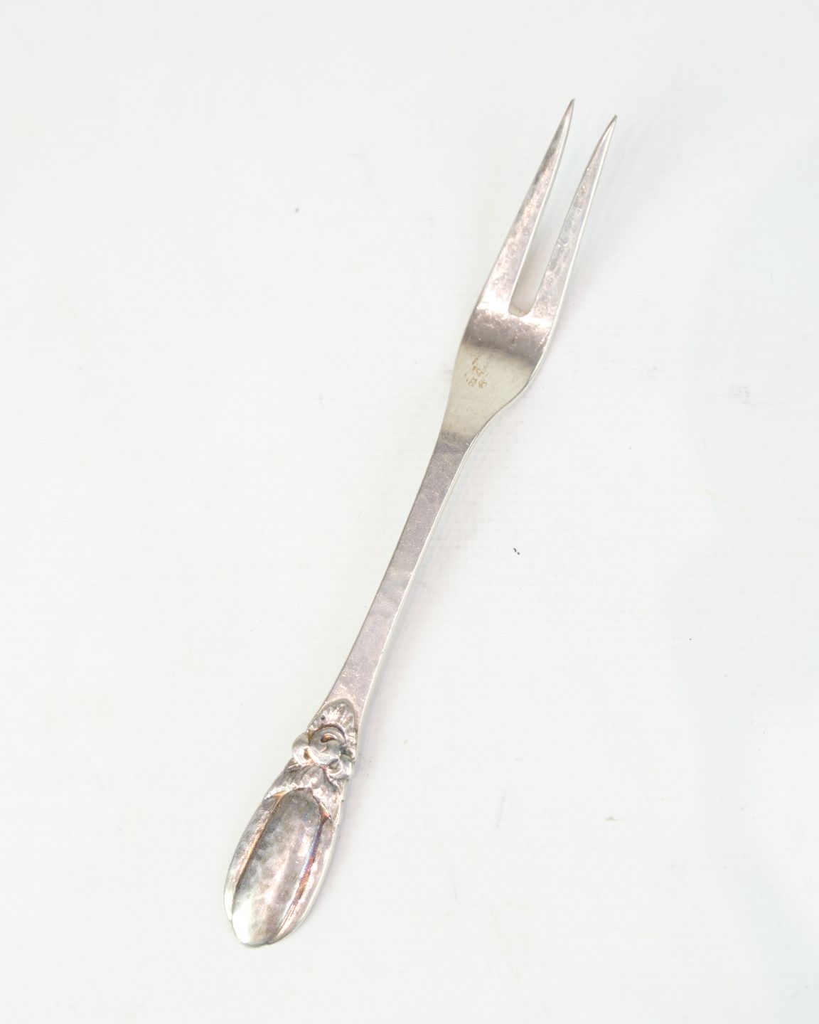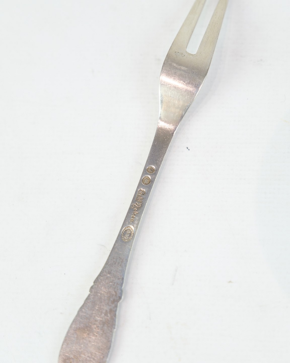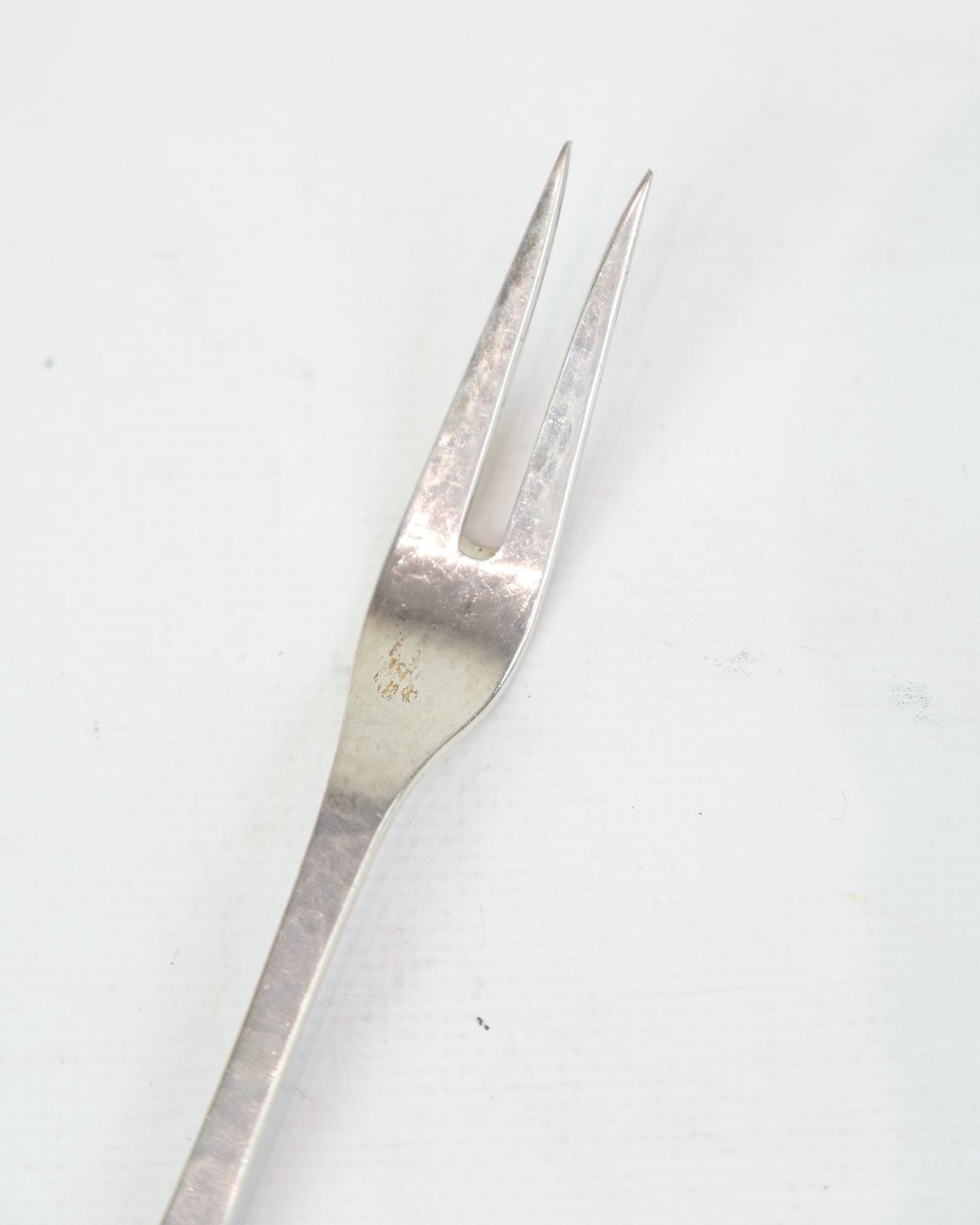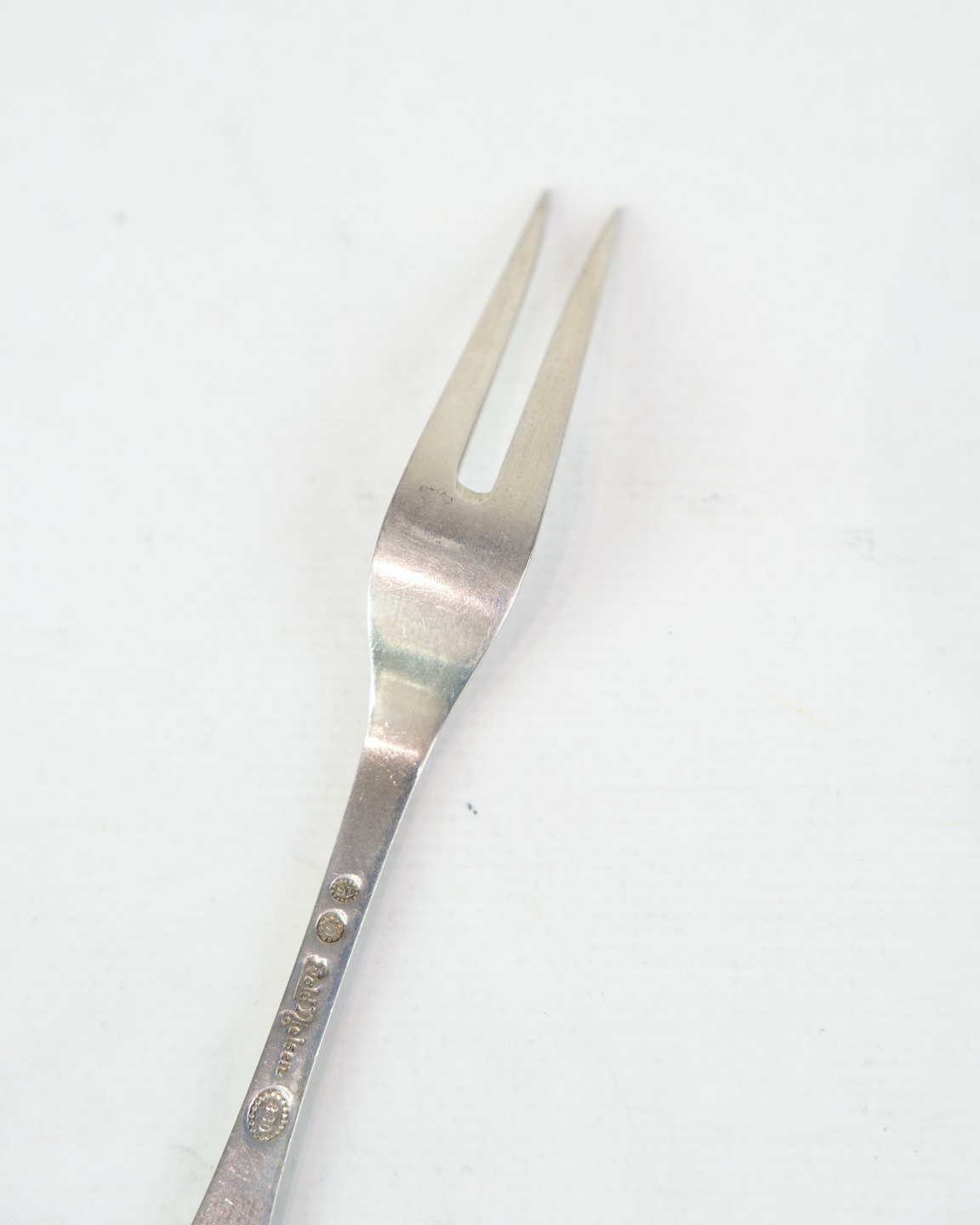 Description: Evald Nielsen cold cuts fork in genuine silver. Hammered pattern, Model No. 16. Length 15 cm. Classic Danish silverwork.