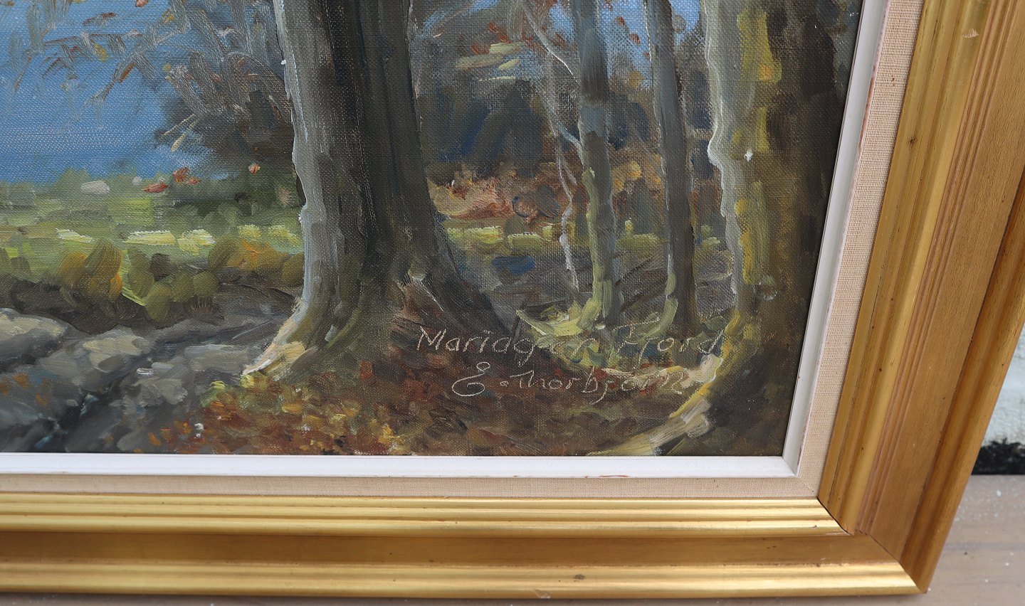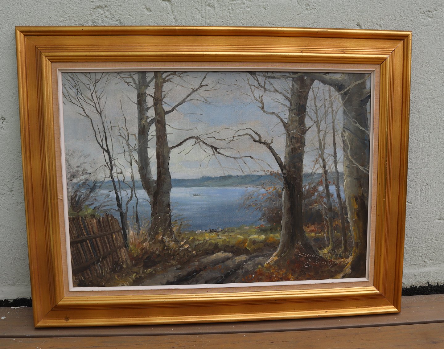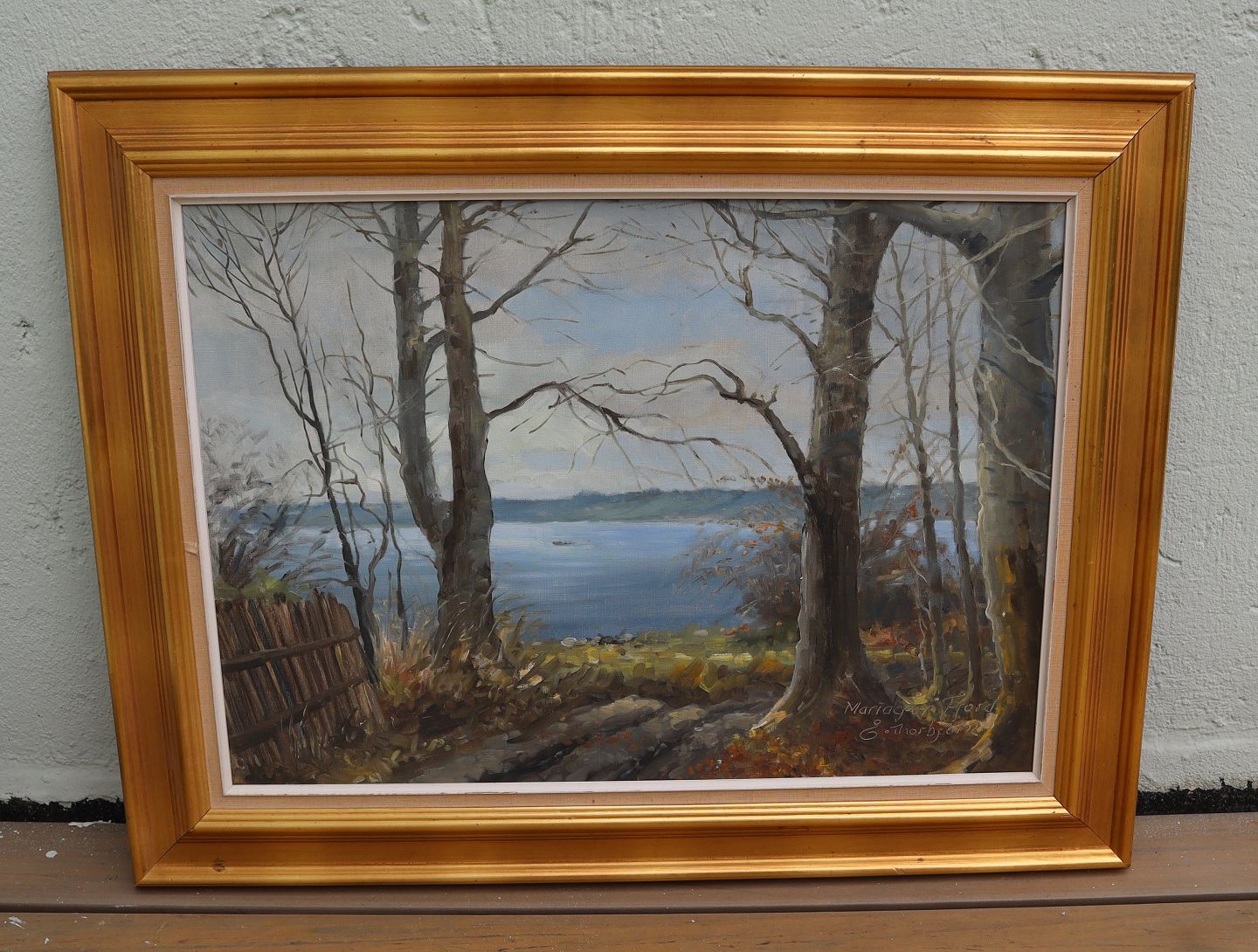 Maleri Olie på lærred: Mariagerfjord signeret E. Thorbjørn 67 x 87 cm inklusiv guldramme