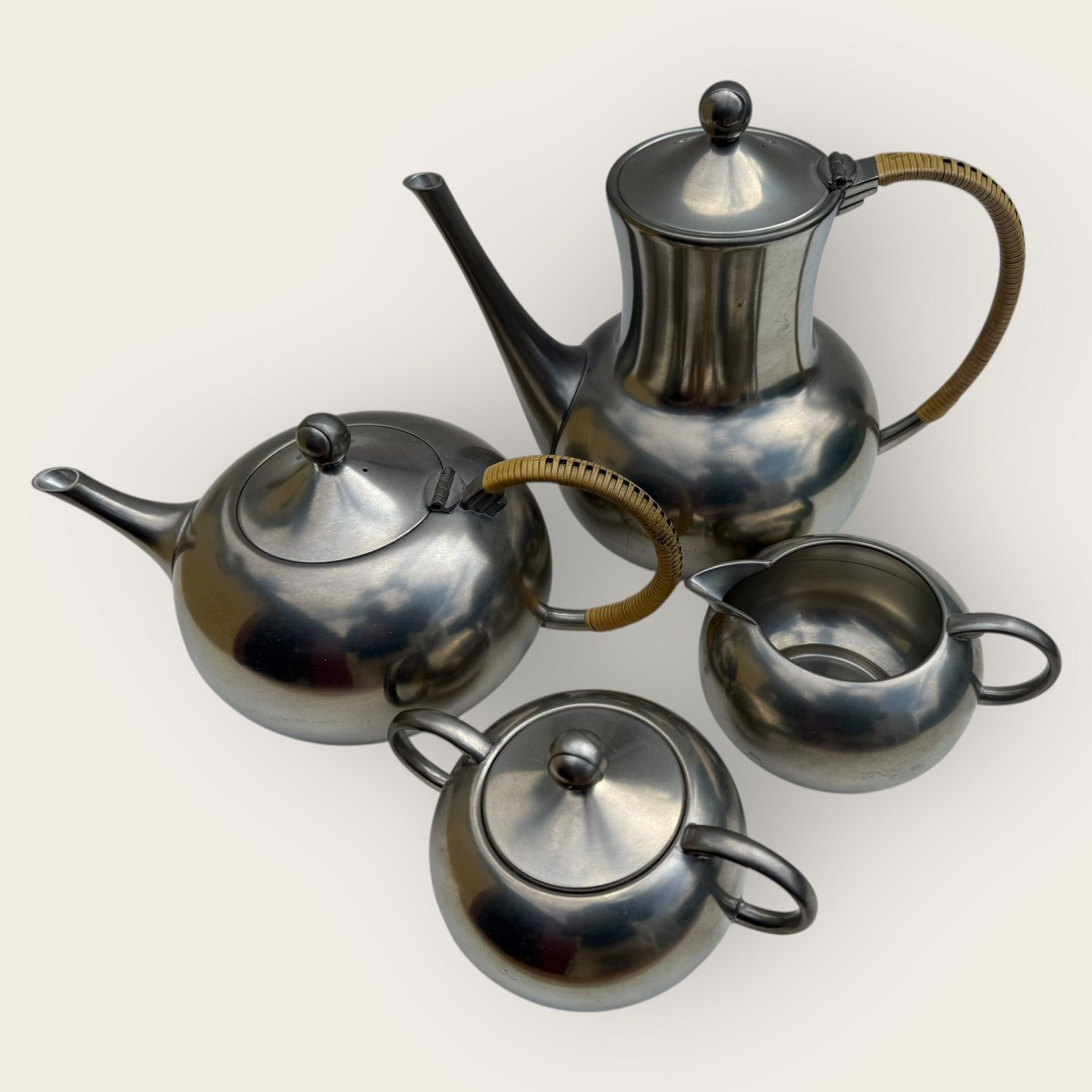 Beskrivelse: Royal Holland KMD Tiel Daalderop, Kaffekande, tekande og fløde - sukker sæt, tin sæt fra 1960'erne, fin stand, kaffekande ca. 18x22cm