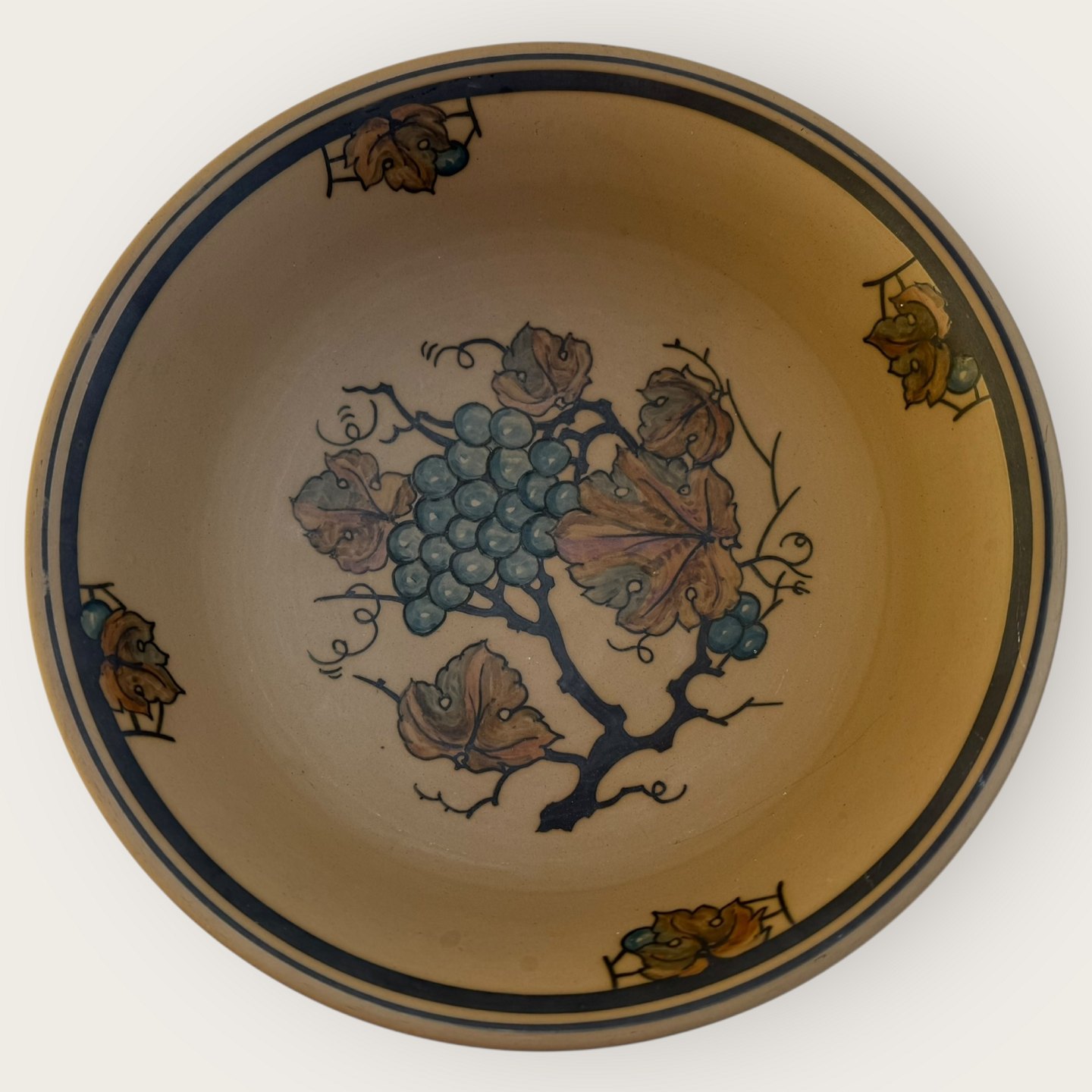 Beskrivelse: Bornholmsk keramik, Hjorth, Brun stentøj, Skål / opsats med bær og efterårsblade som dekoration, Nr. 41, 12cm høj, 25cm i diameter *Pæn stand*