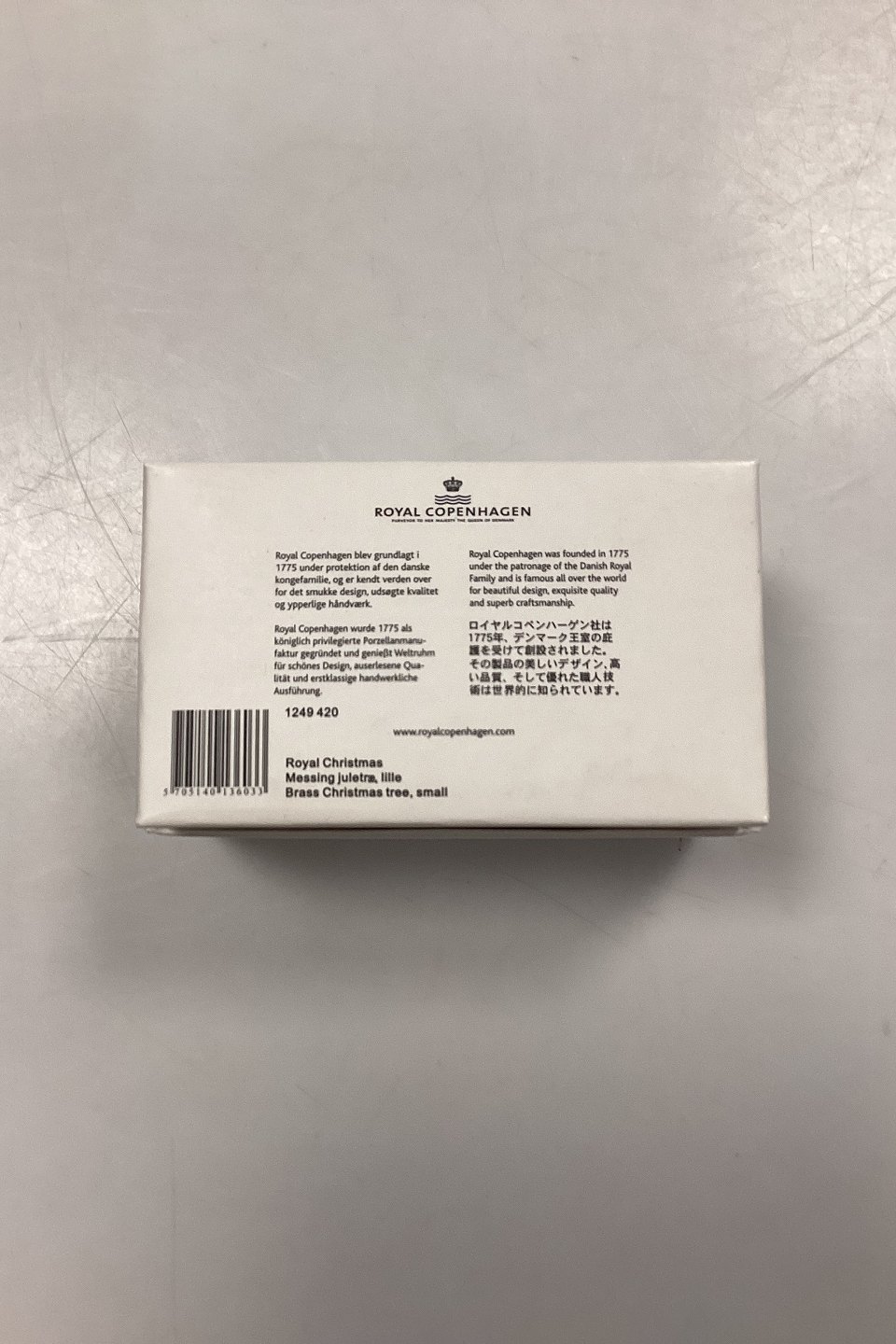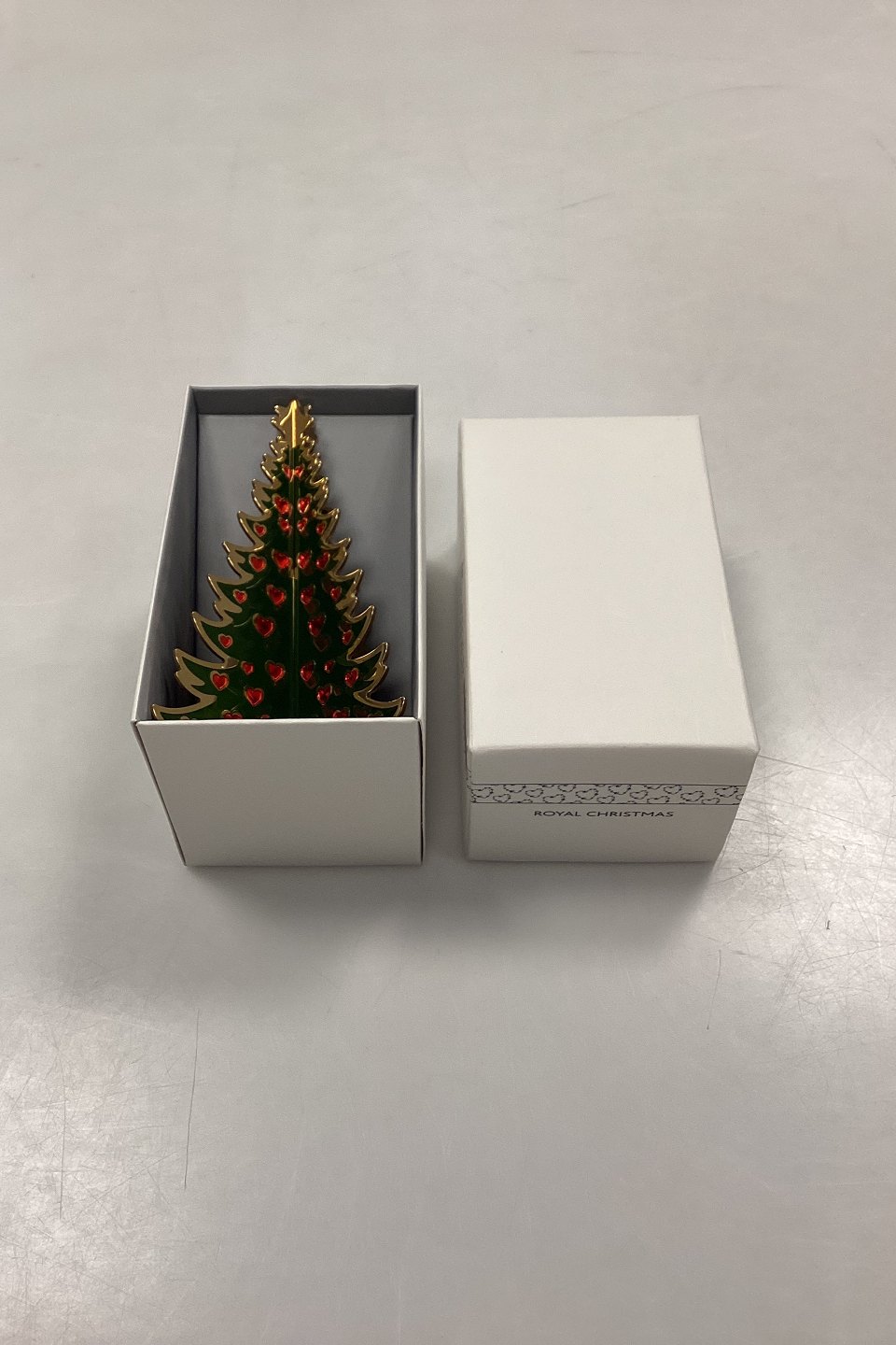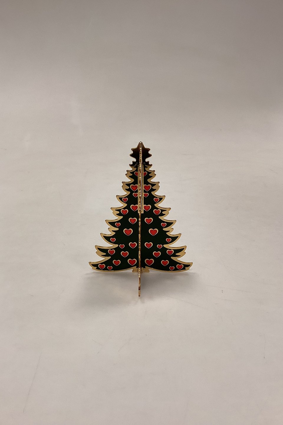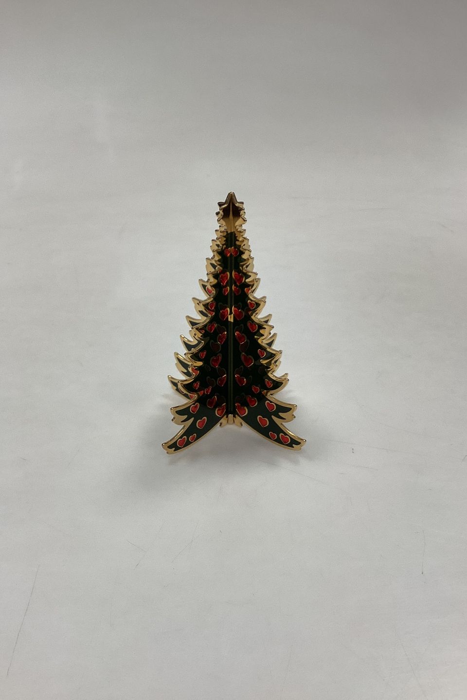 Beskrivelse: Royal Copenhagen Christmas Lille Juletræ. Bordpynt i messing med grøn emalje og røde hjerter.