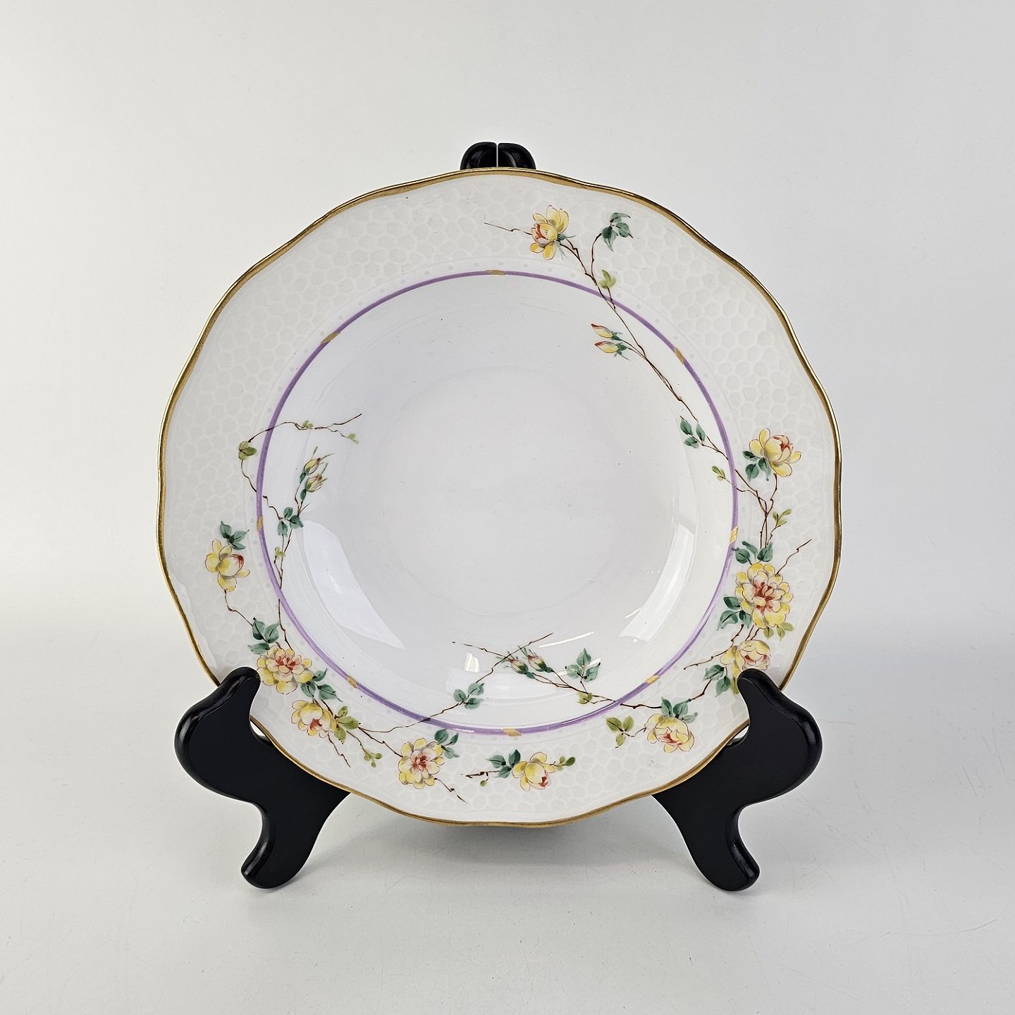 Service i hvidt porcelæn med hamret kantmønster dekoreret med gule blomsterranker og lyslilla streg. Stellet er med guldkant og det er mærket med bølger anvendt frem til 1890.