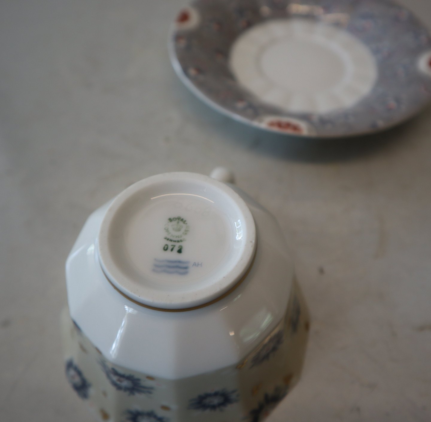 072 Coffee cup 15 cl & saucer 073 13.7 cm (8608) The Royal Copenhagen Fairytale Pattern was designed by Finn Næss-Schmidt and the actual drawings for the transferware were designed by Jørgen Nielsen . The Fairytale service was decorated on the Angular form in both Grey and Terracotta versions so that all pieces would mix and match. At the time of production it was the most complex multicolor transferware ever produced by the Royal Copenhagen Factory.
