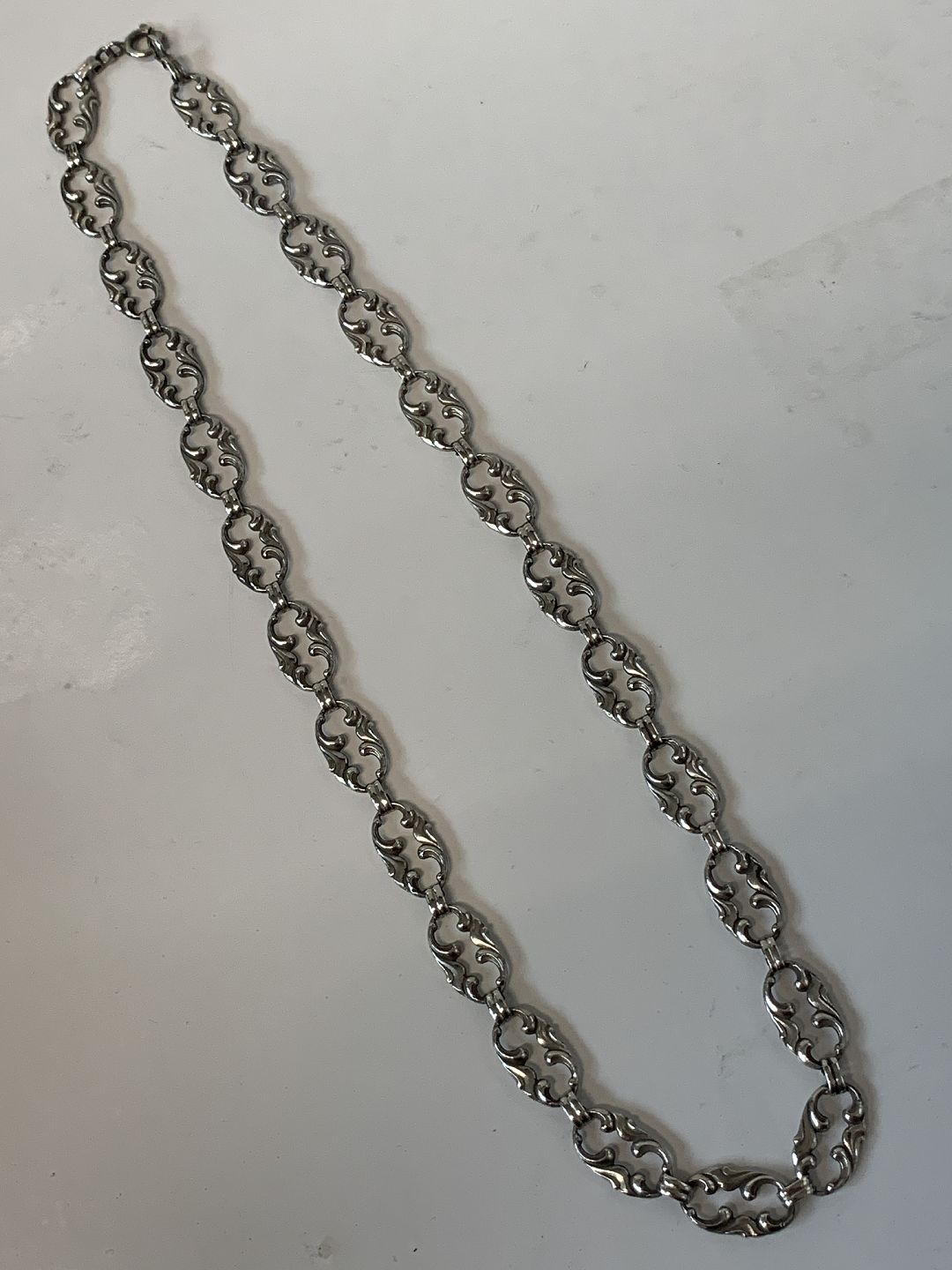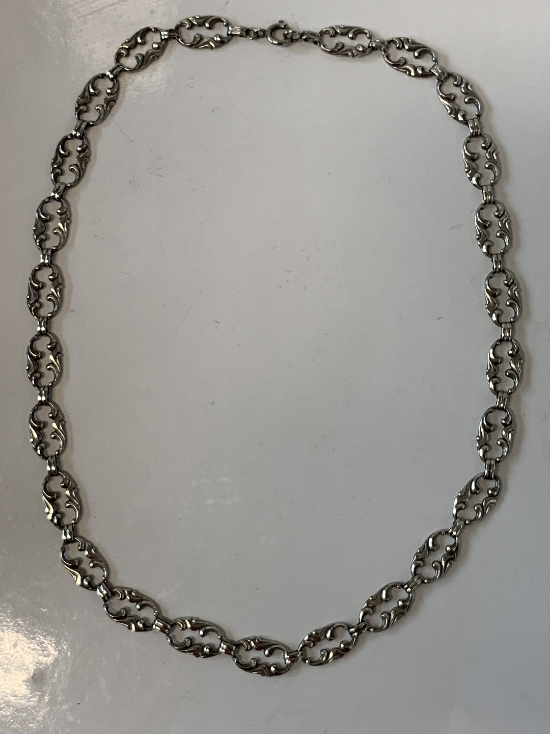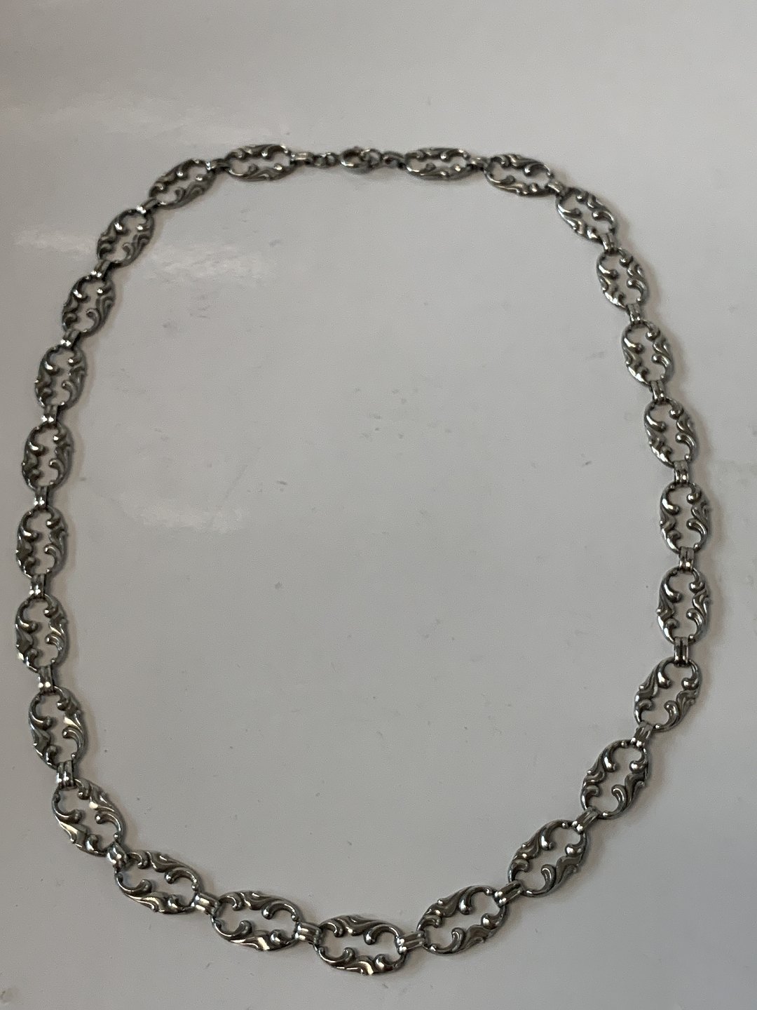 Description: Beautiful and elegant silver necklace, made of 830 silver. The chain has beautiful detailed links that give the necklace a beautiful feminine look. The silver chain can be used especially for a beautiful dress, but can also be used for a nice shirt.