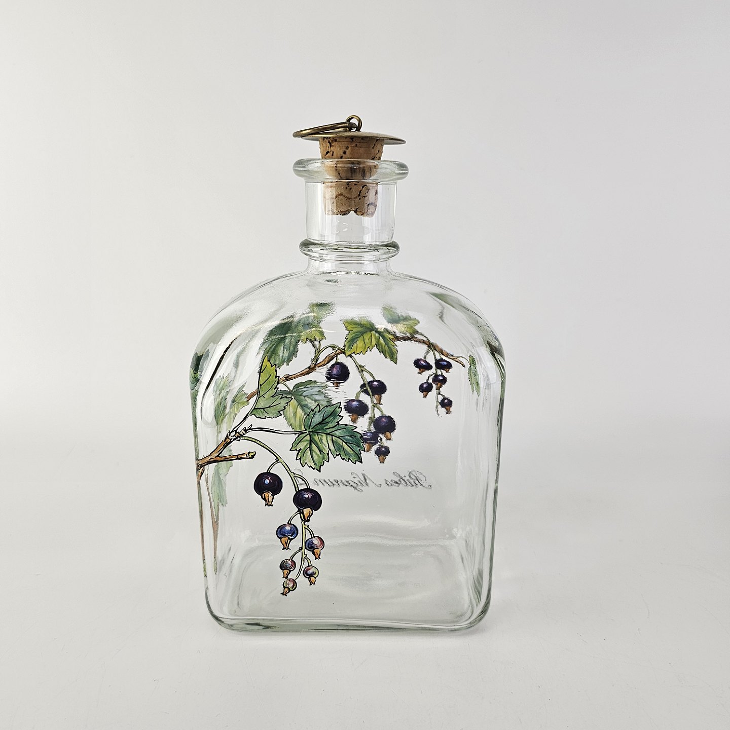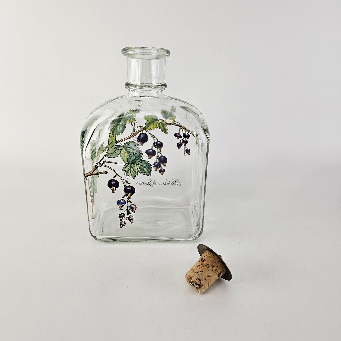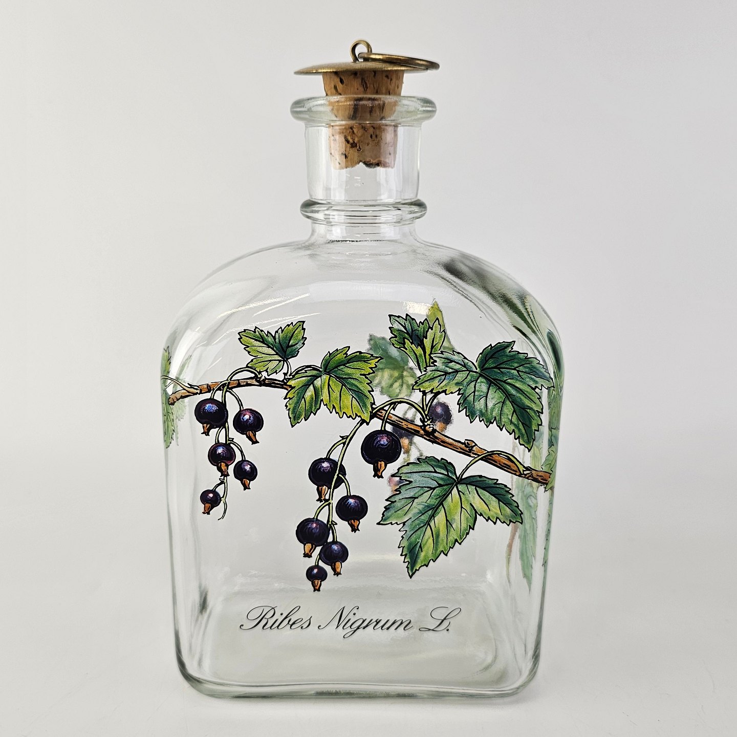 Beskrivelse: Karaffel i klart glas med korkprop fra serien Brændevins Amatøren, dekoreret med en gren af solbær og teksten Ribes Nigrum L.