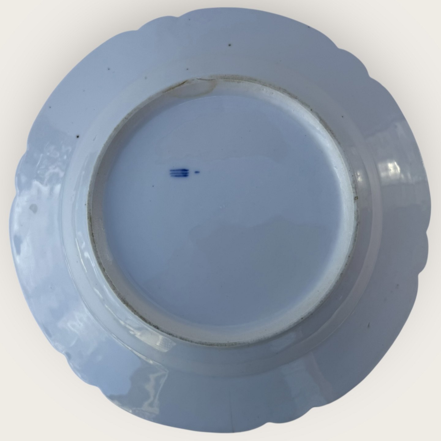 Description: Royal Copenhagen, Rokoko weiß, flacher Teller, 26 cm Durchmesser, hat einen kleinen Haarriss (siehe Foto)