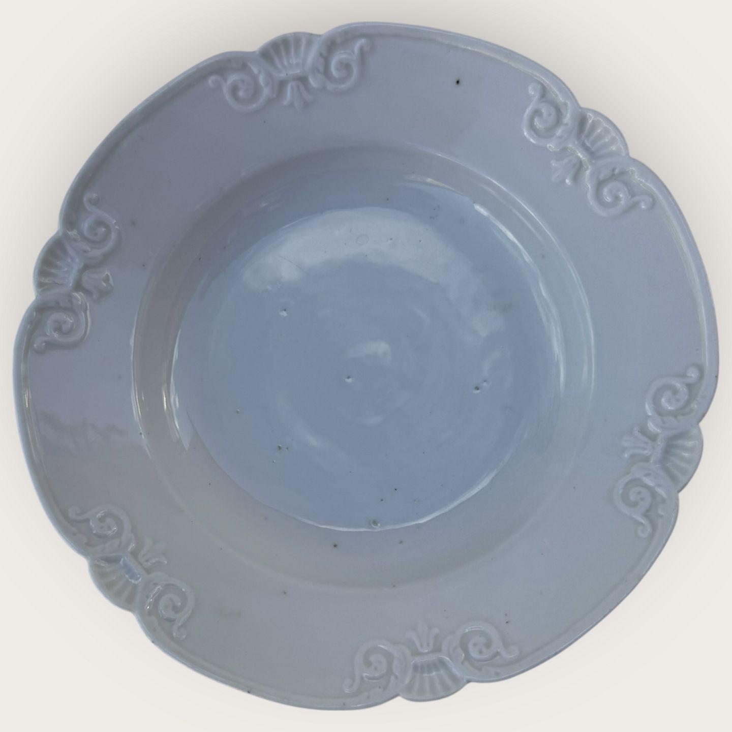 Description: Royal Copenhagen, Rokoko weiß / Rokoko hvid, tiefer Teller, 21,5 cm Durchmesser, erscheint mit ein paar kleinen Kratzern, wir haben auch 3 Stücke mit Reparaturen für 100 kr pro Stück.