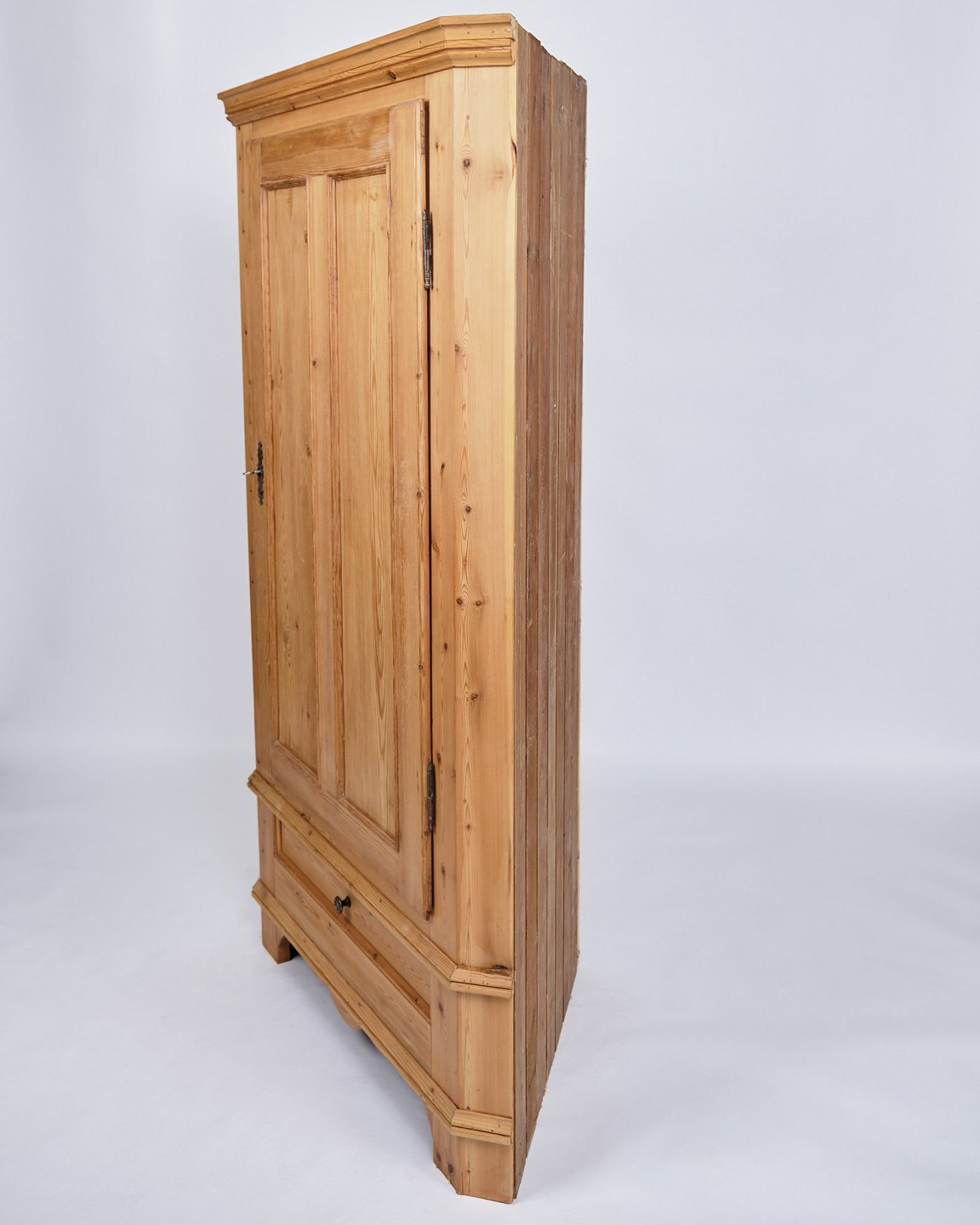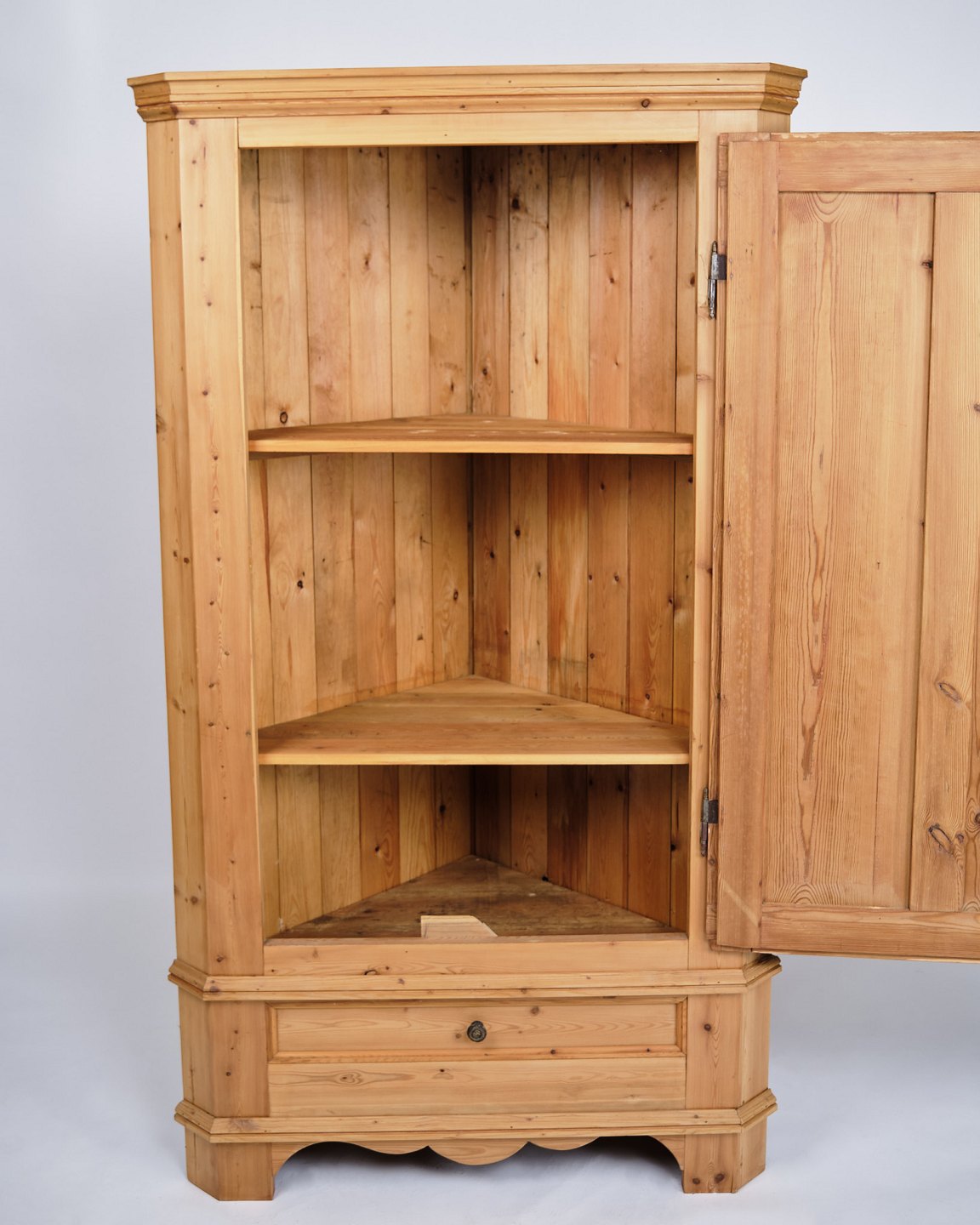 Beskrivelse: Antikt hjørne fra 1920’erne udført i massivt fyrtræ med originale messingbeslag.