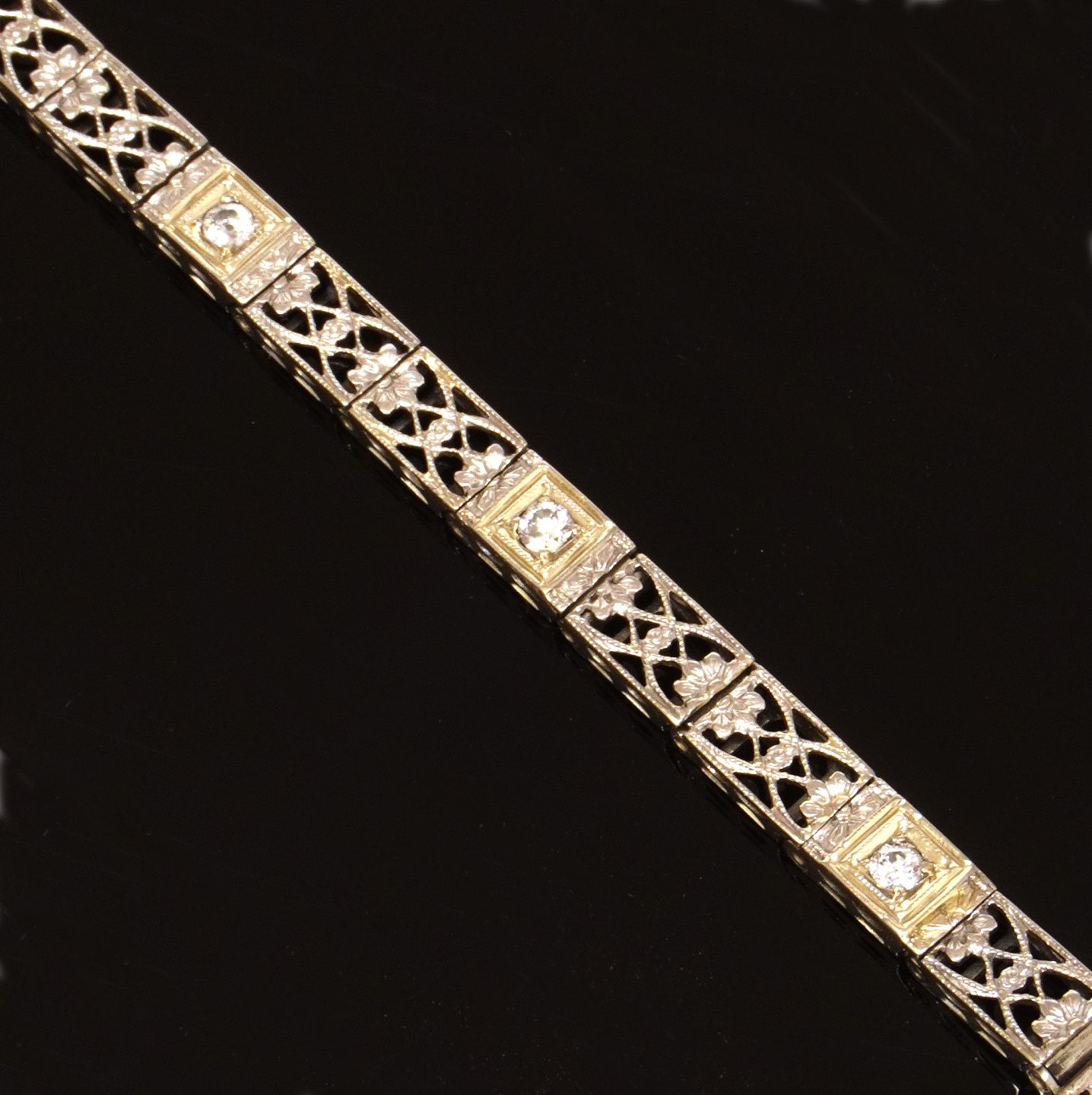 14kt hvidguld leddelt armlænke prydet med gennembrudte dekorationer og tre diamanter ca. 0,25ct i alt. L: 18,5cm. B: 4,5mm