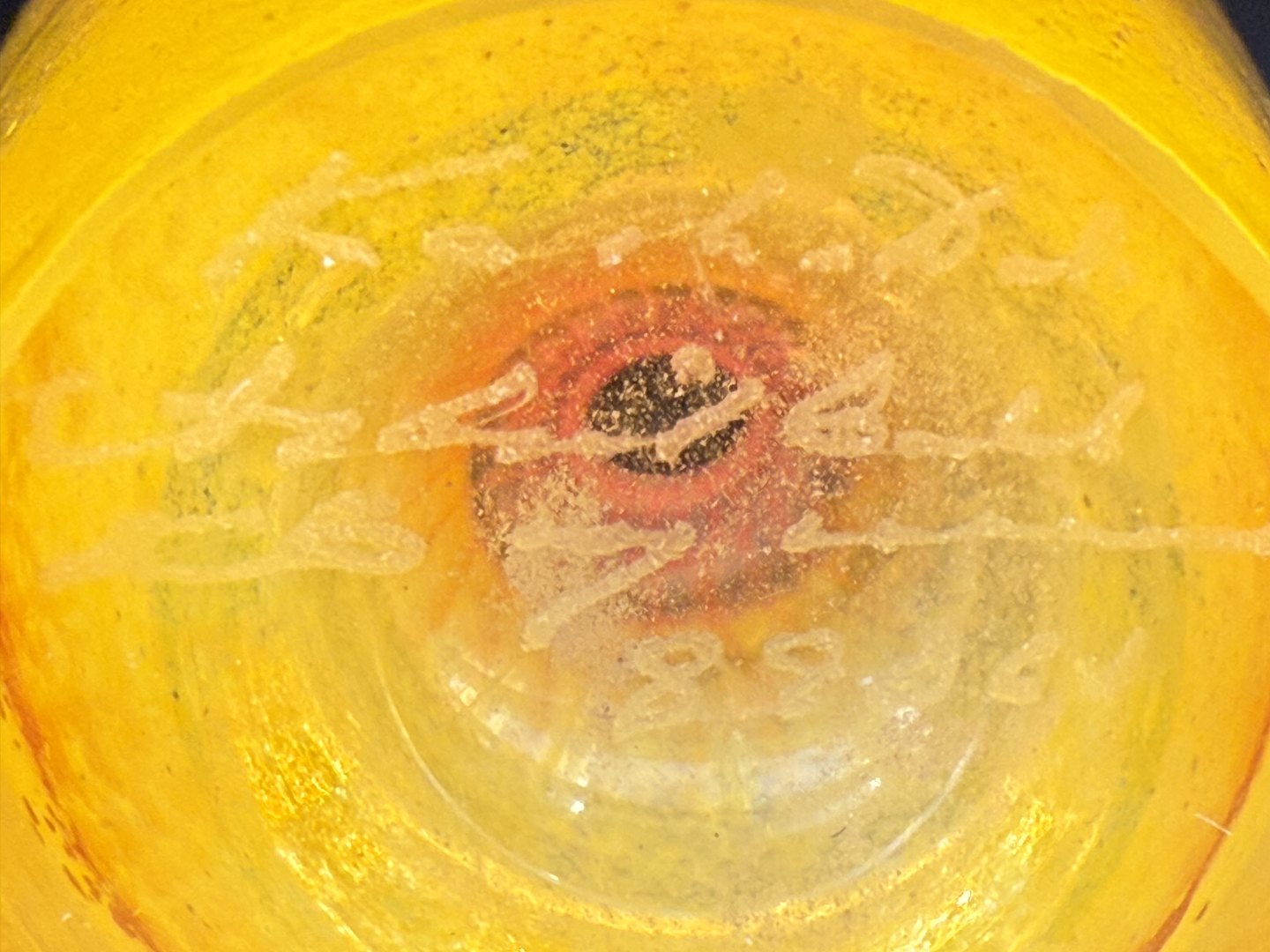 Beskrivelse: Kosta Boda, Sverige, Gul/Orange glasvase med blå hank og kant, #89061, højde 12 cm *fin stand*