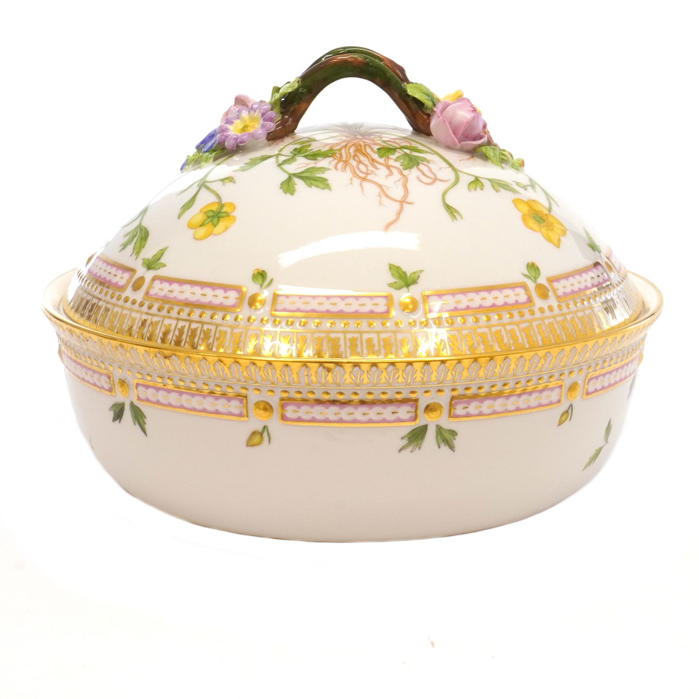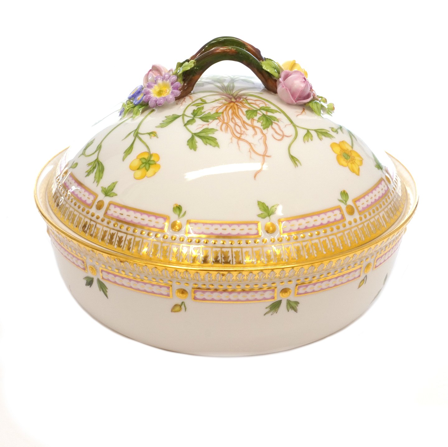 Beskrivelse: Royal Copenhagen Flora Danica rund terrin / lågskål #3568
