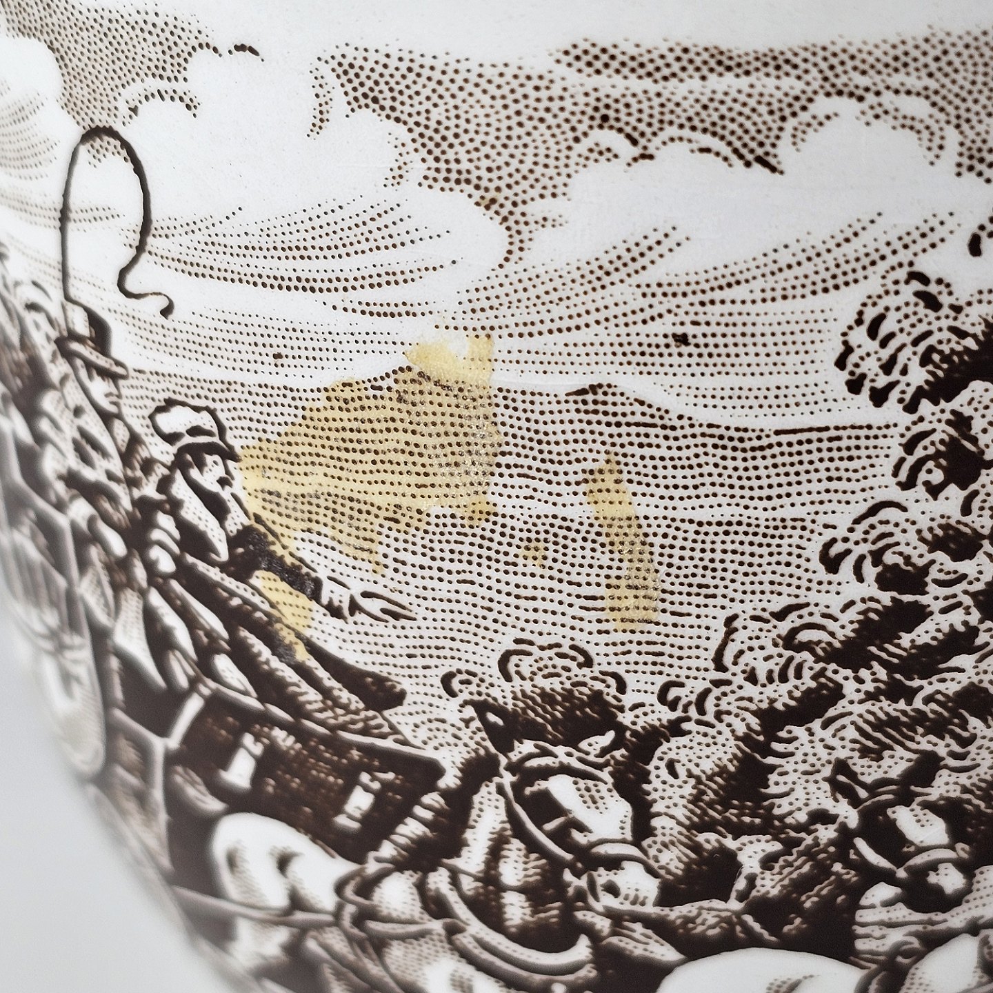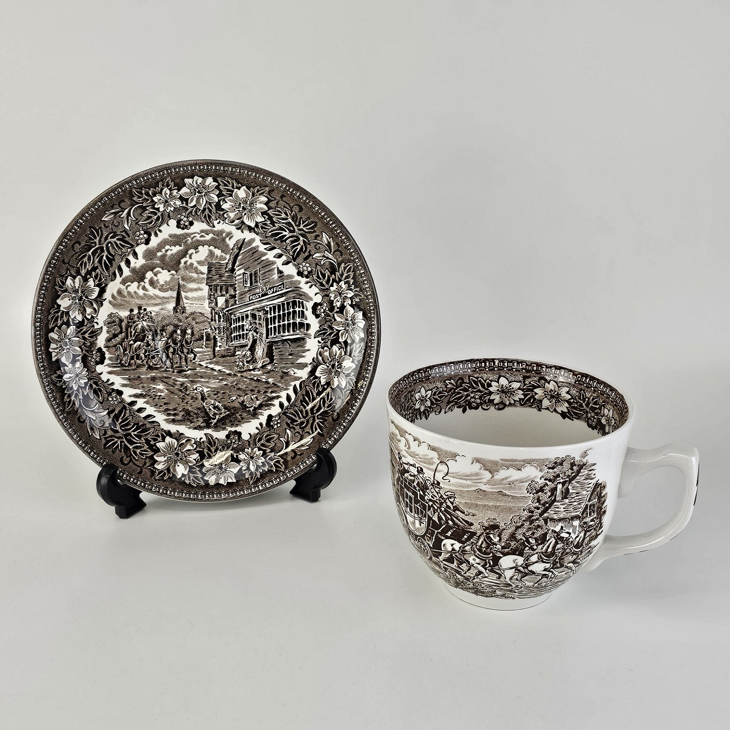 Beskrivelse: Stor kop og underkop i engelsk fajance fra stellet Coaching Taverns 1828