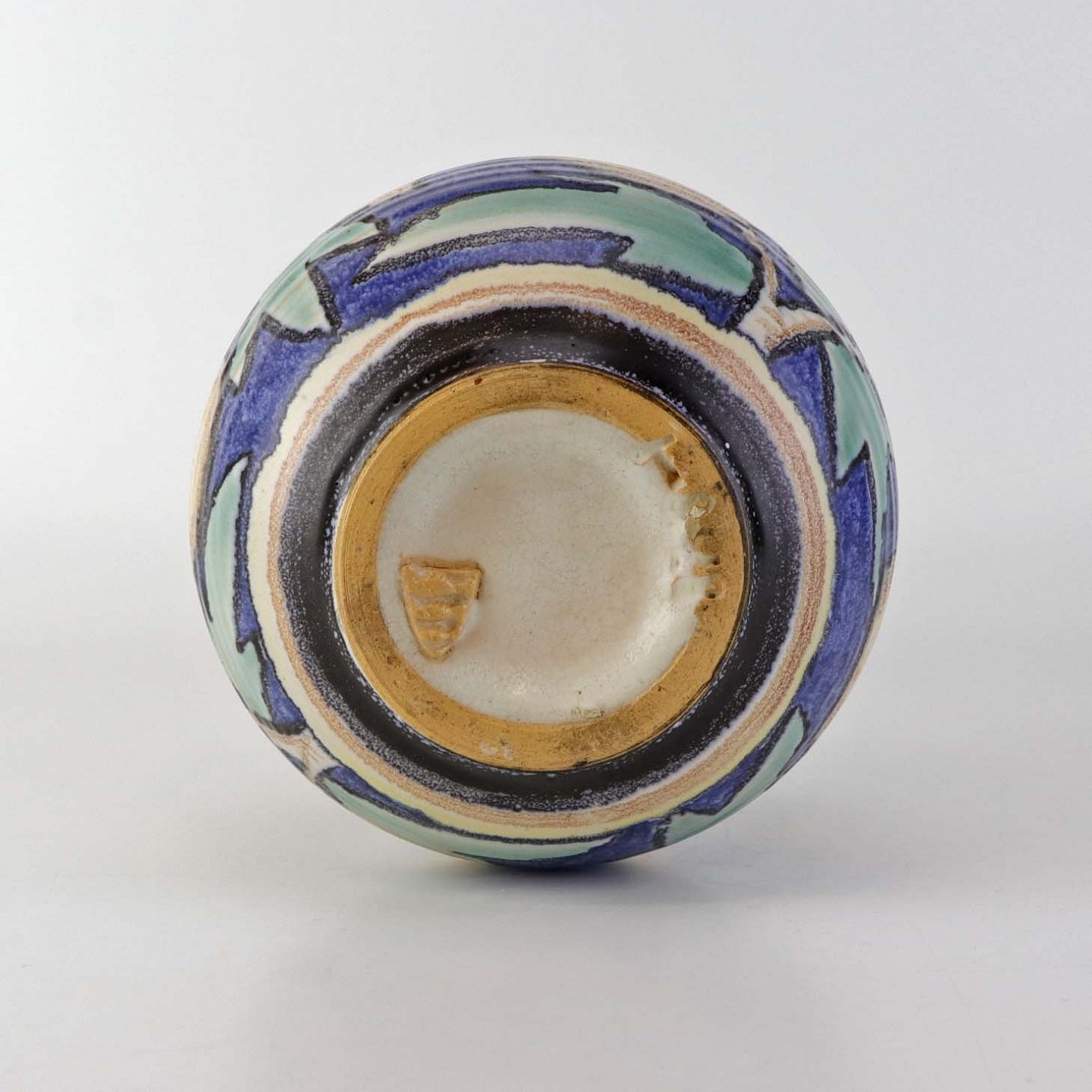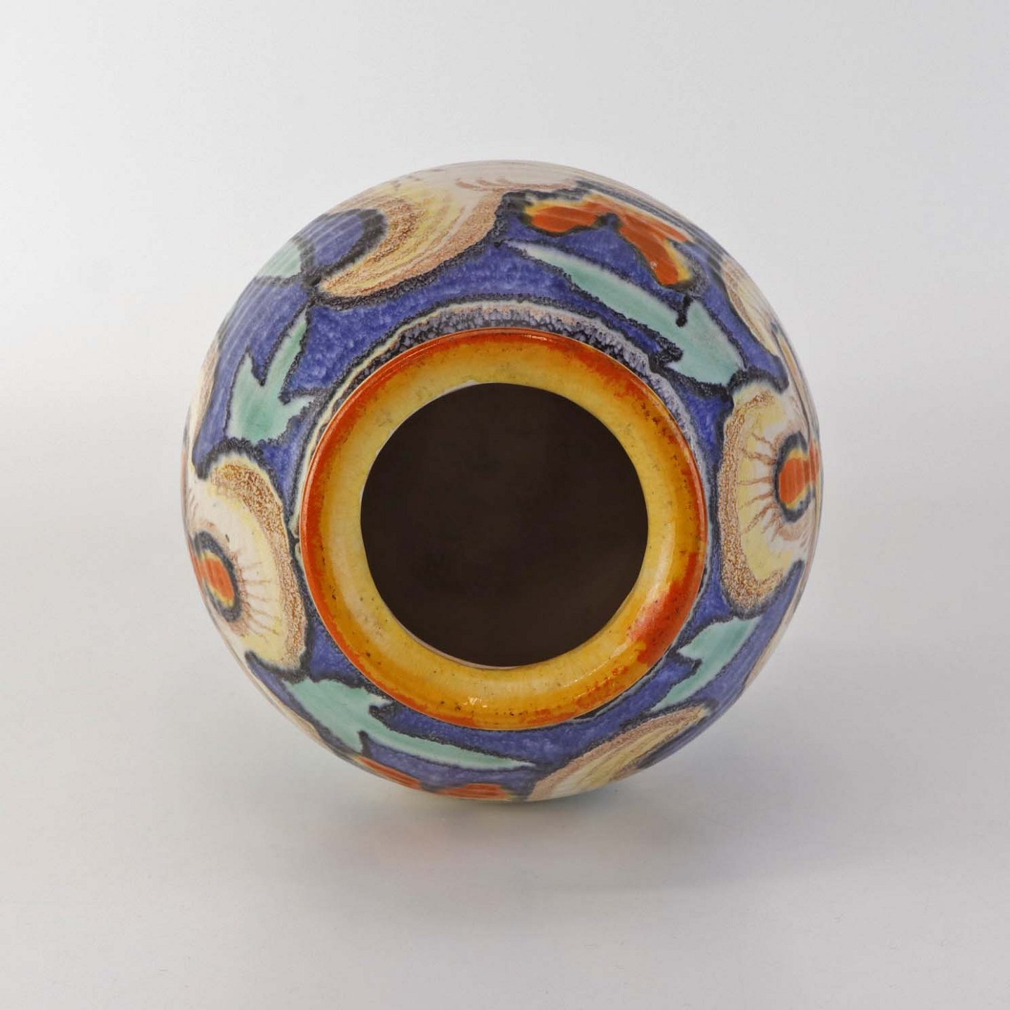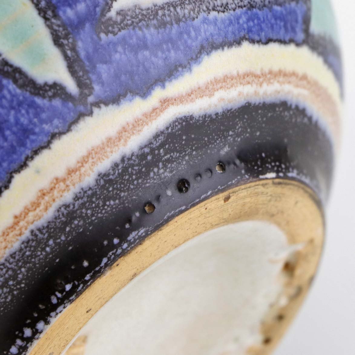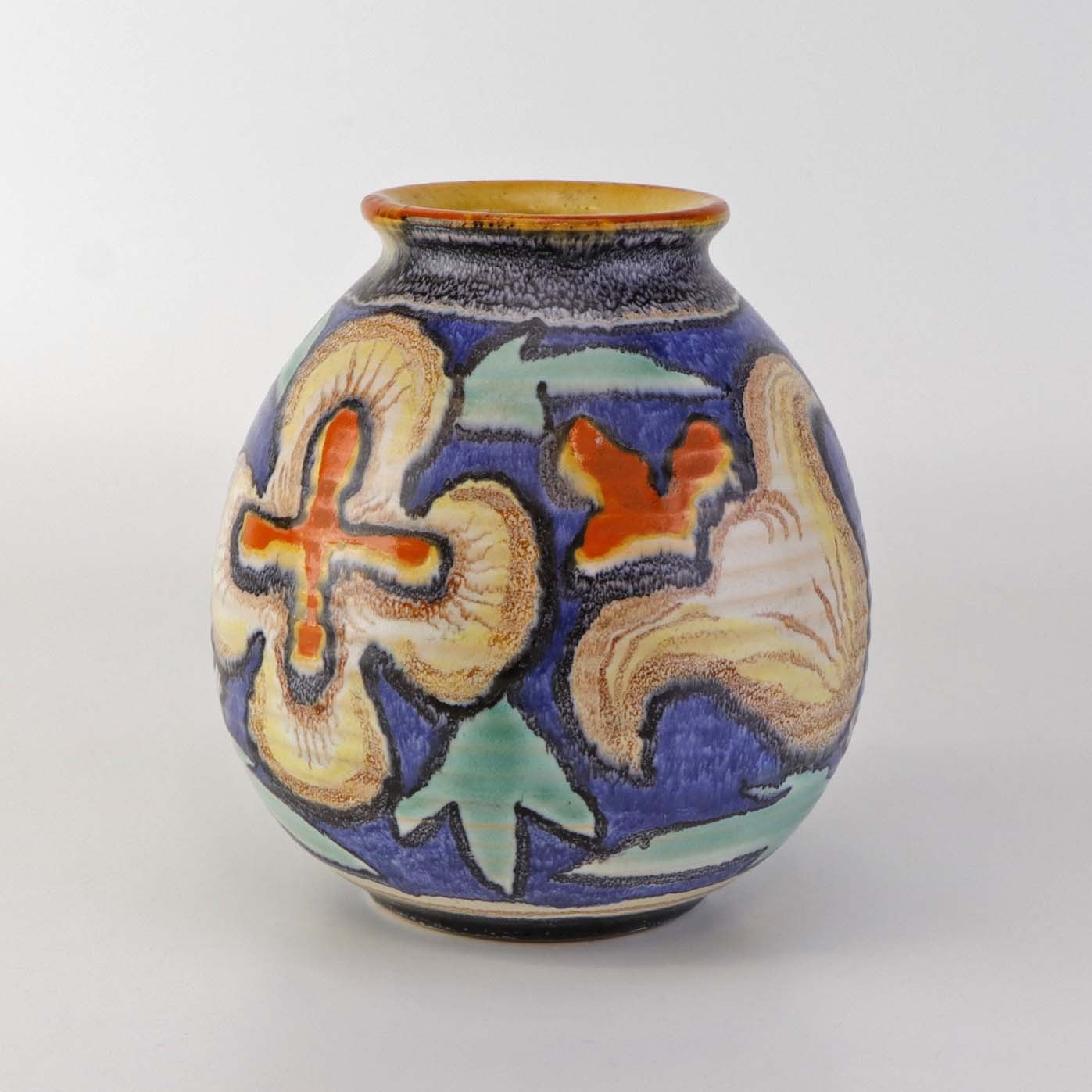 Beskrivelse: Oval vase i keramik med let riflet struktur og dekoreret med farverig blomstermotiv på blå baggrund.