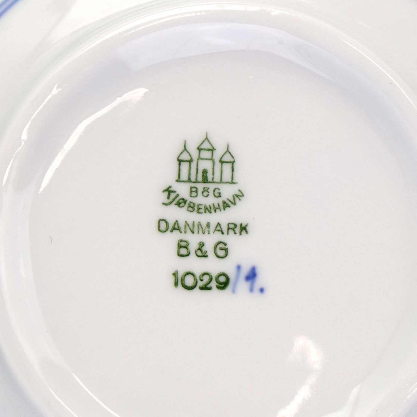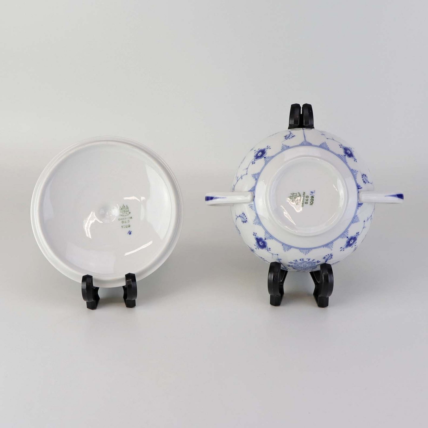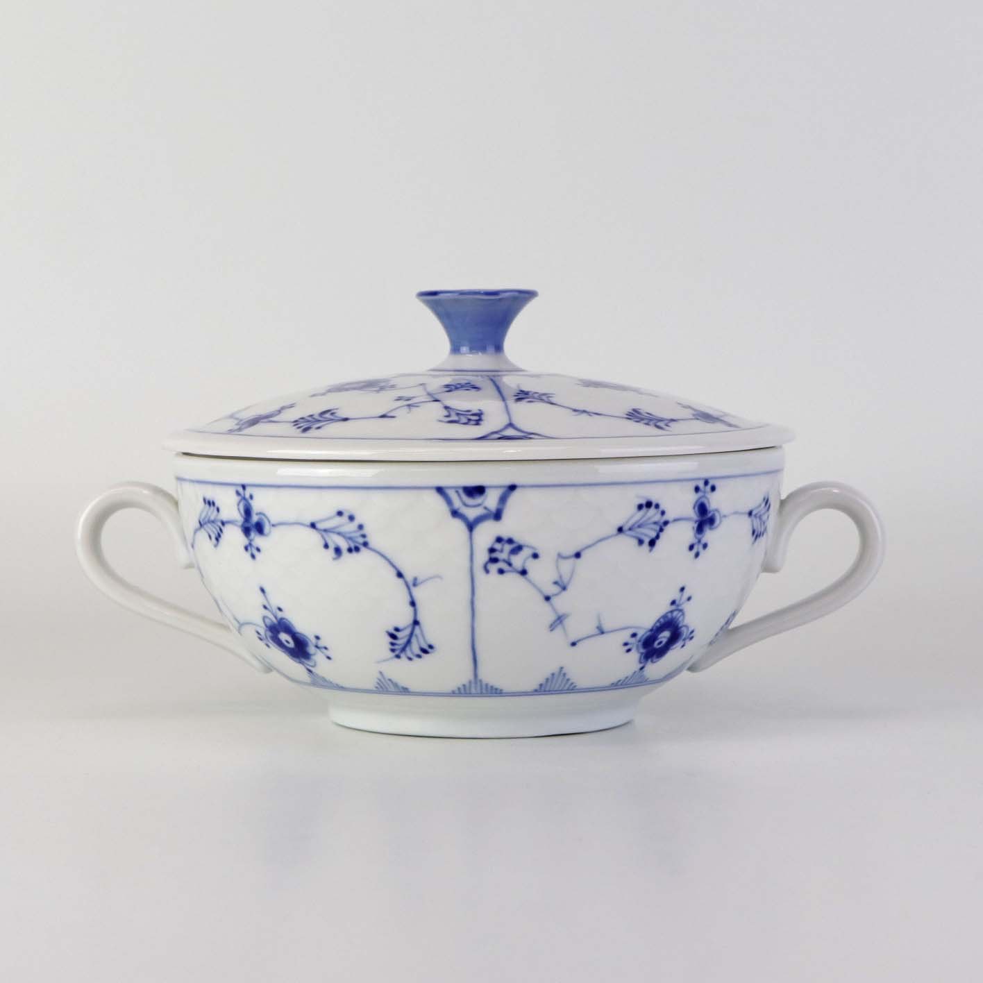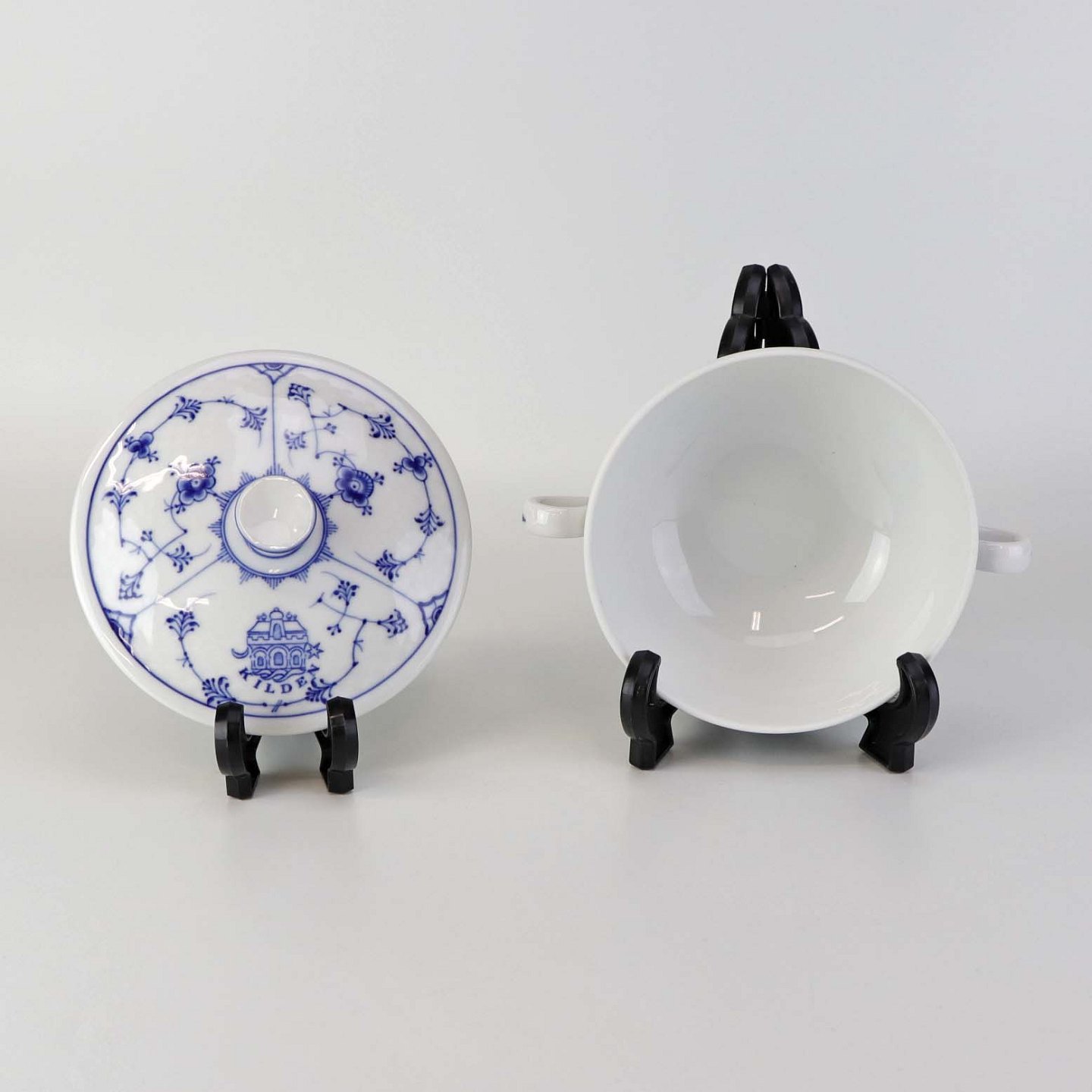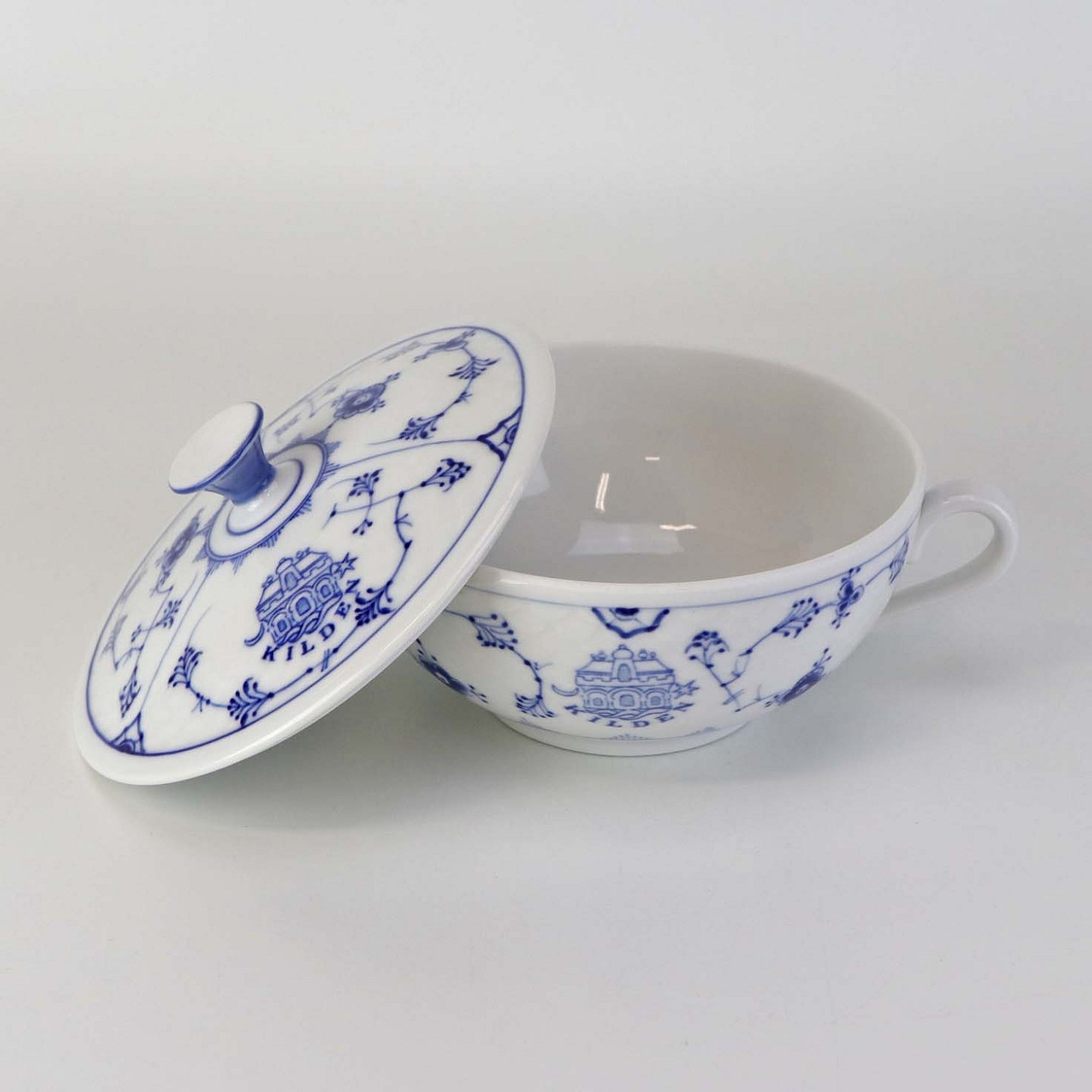Beskrivelse: Boullionkop med låg i hotelporcelæn med motiv fra restaurant Kilden i Aalborg fra stellet Blåmalet. Nr. 1029