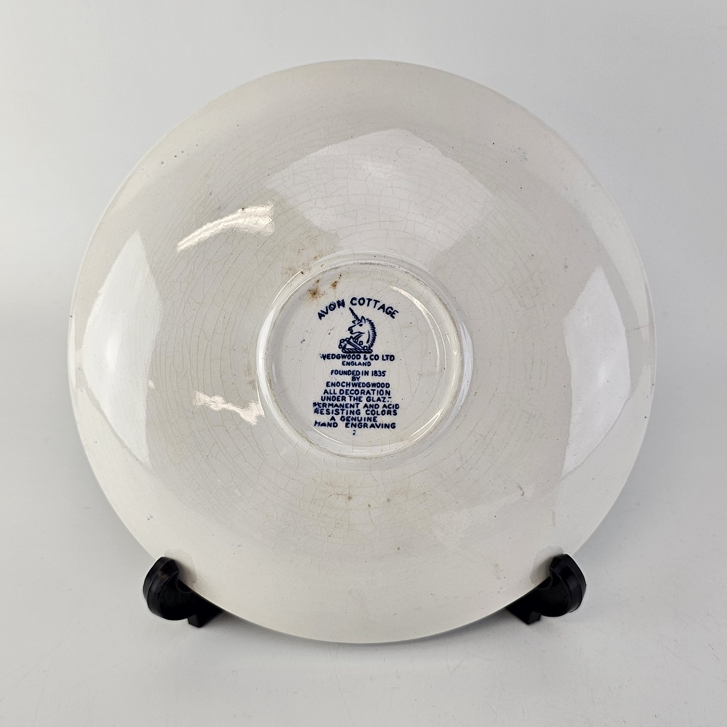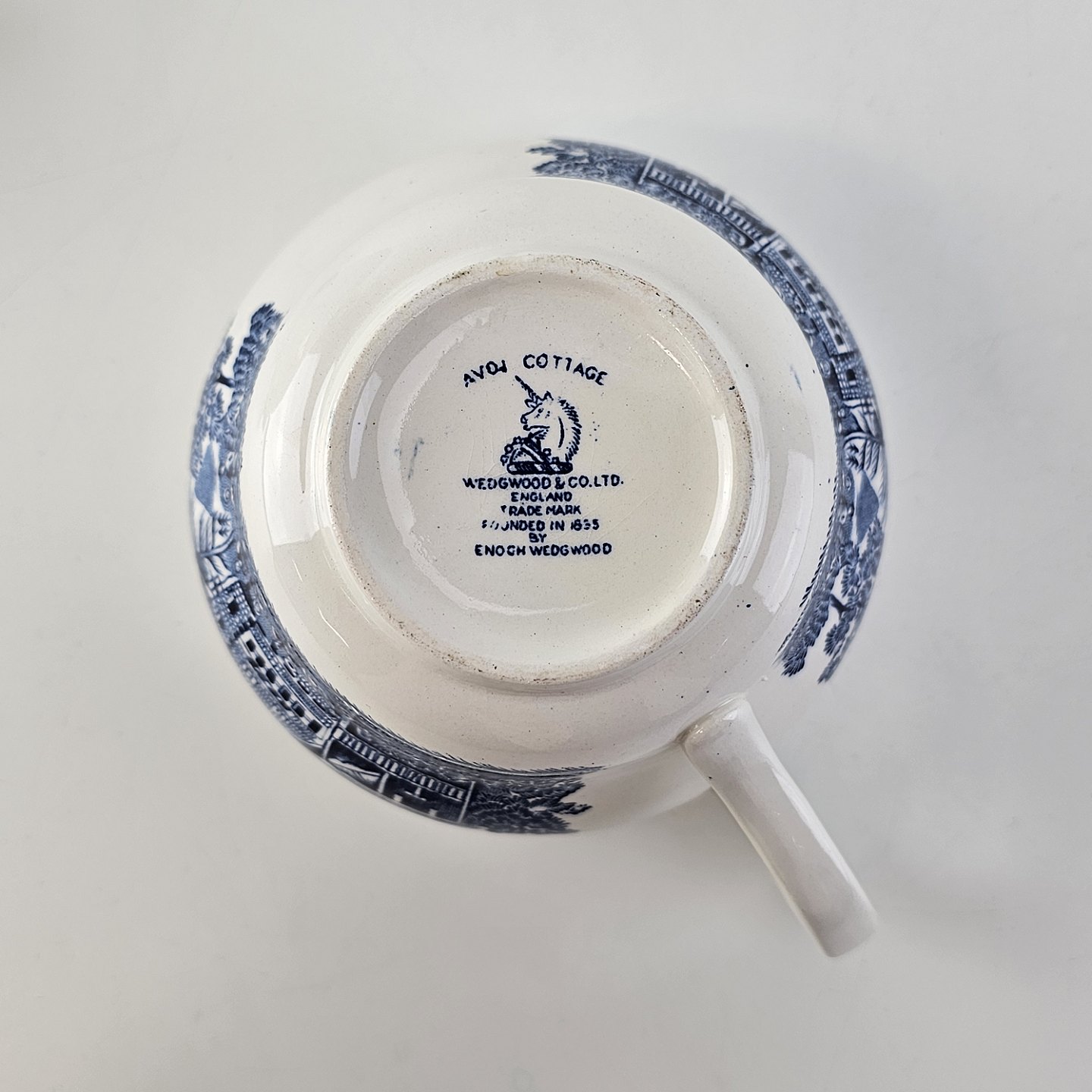 Beskrivelse: Blå kop og underkop i engelsk fajance fra stellet Avon Cottage