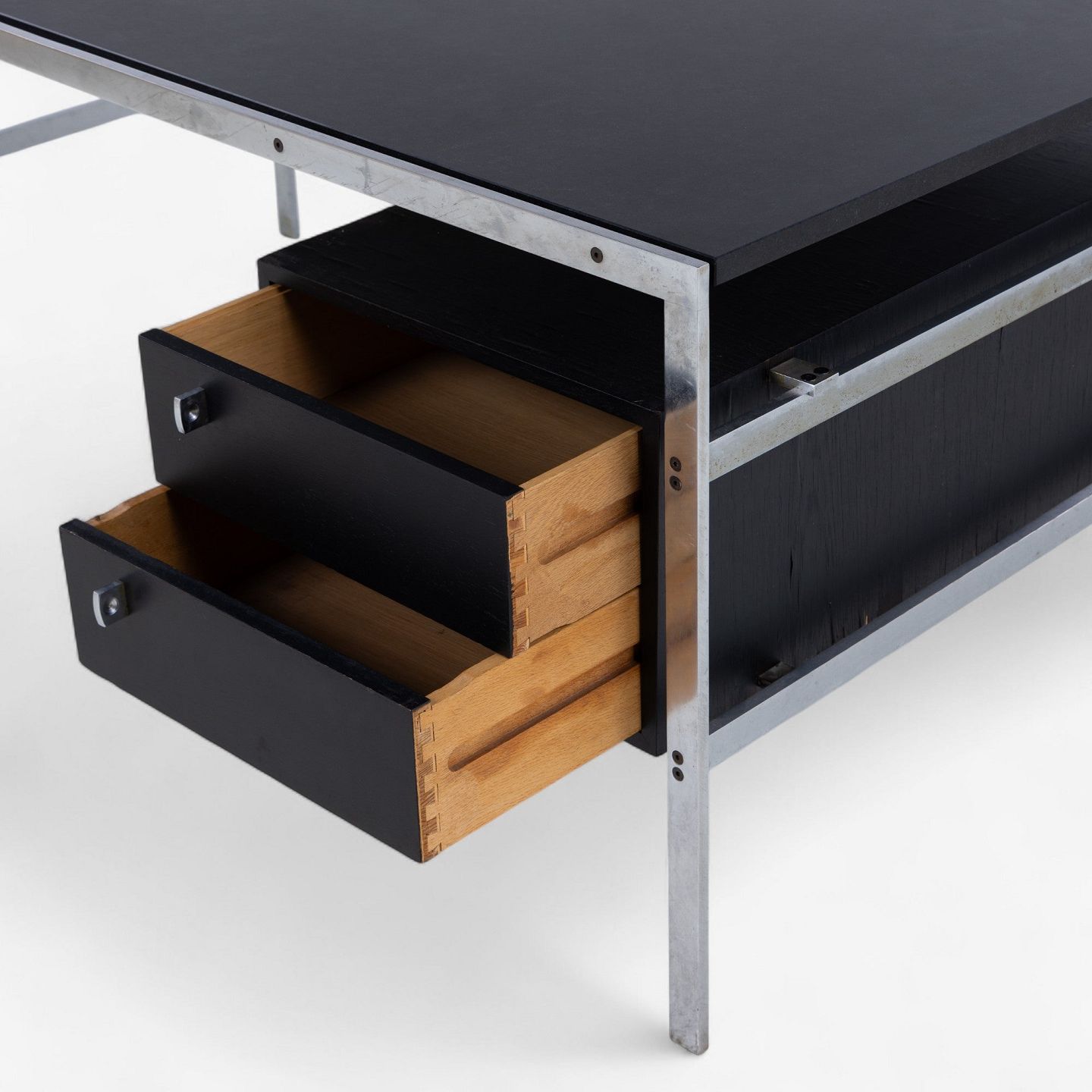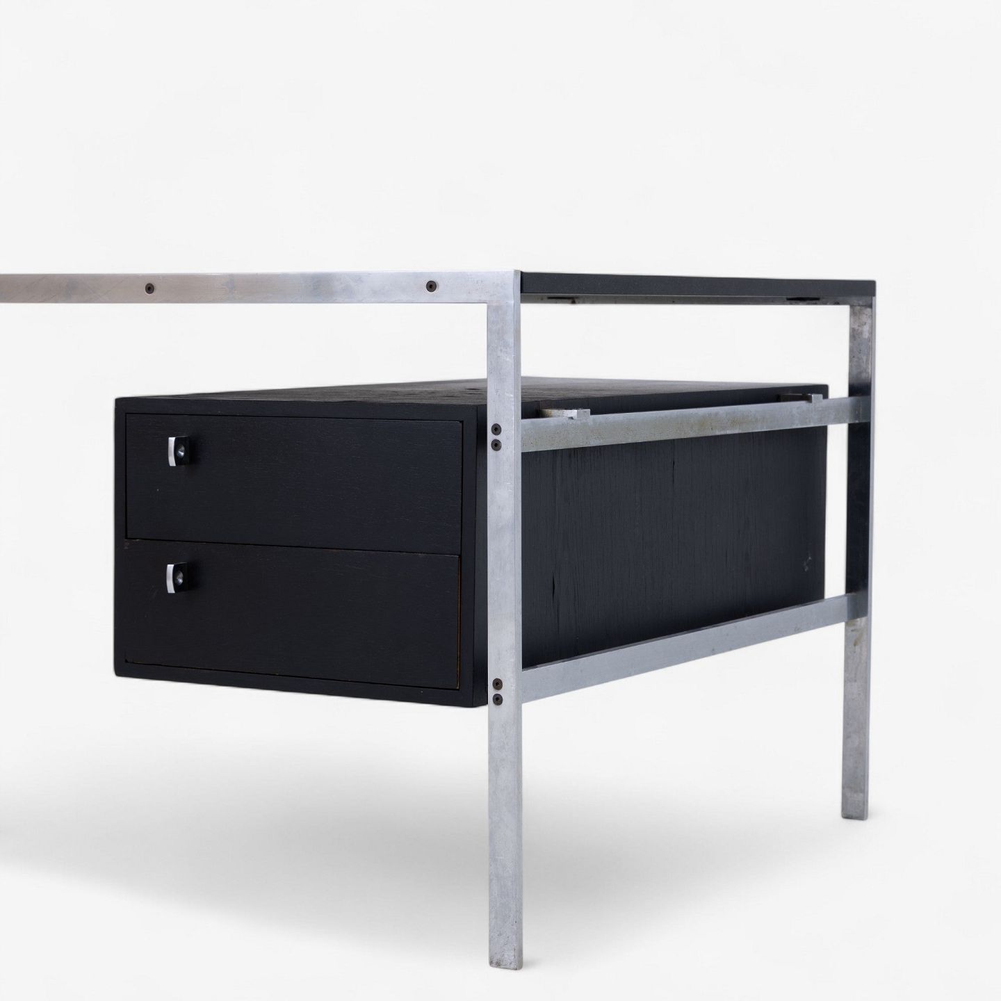 BO 550 - Skrivebord i stål med plade i 'Nero Assuloto'-granit med skuffemodul i sort wengé.